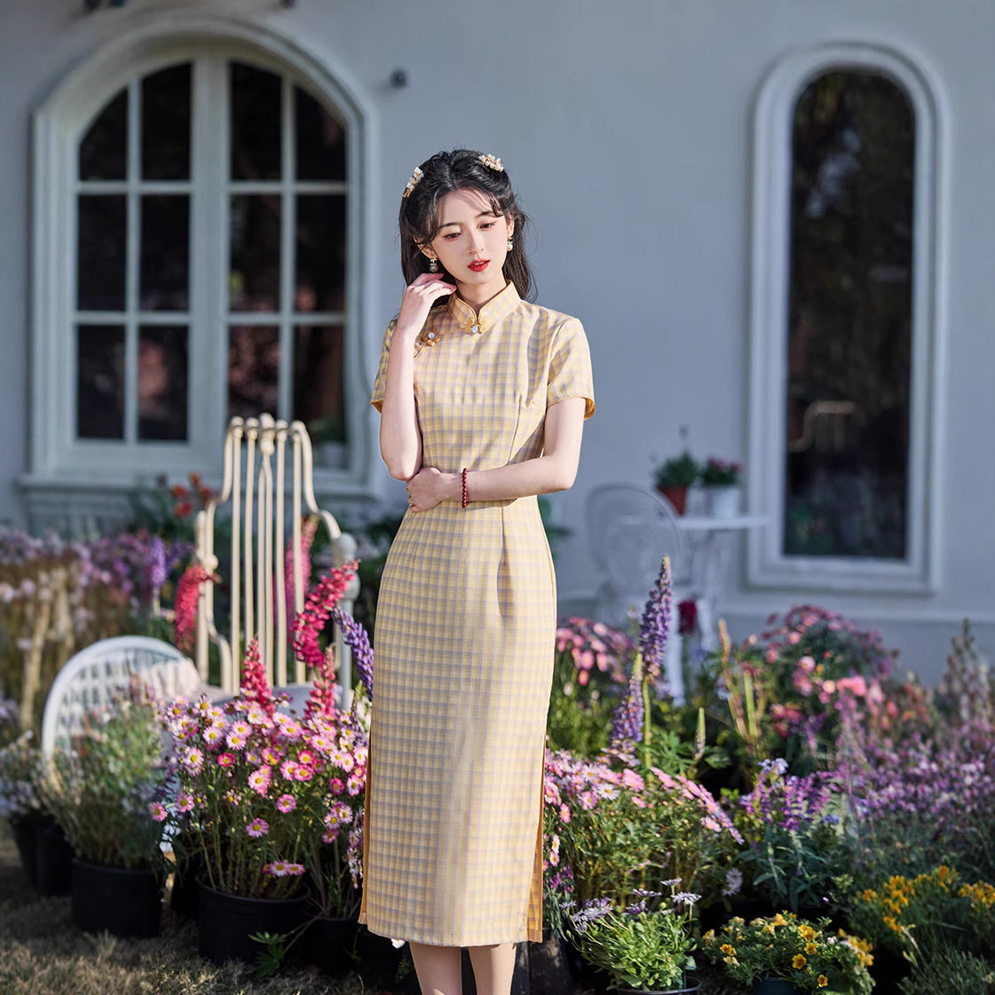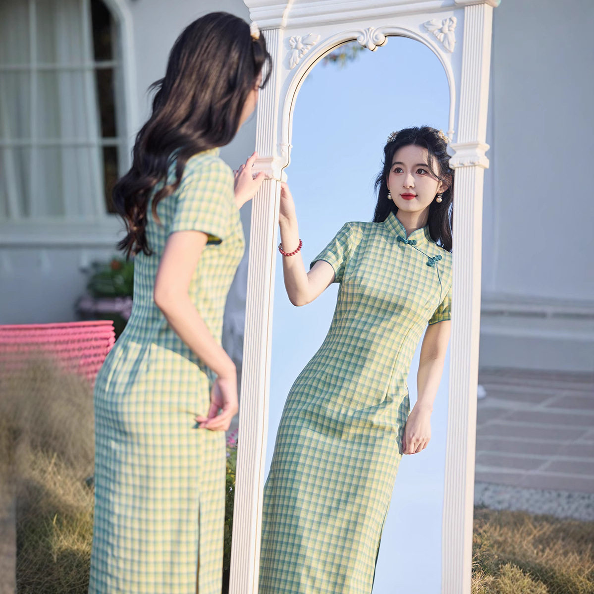 夏季文艺格子旗袍新中式民国风学生年轻款少女薄仿棉麻日常连衣裙