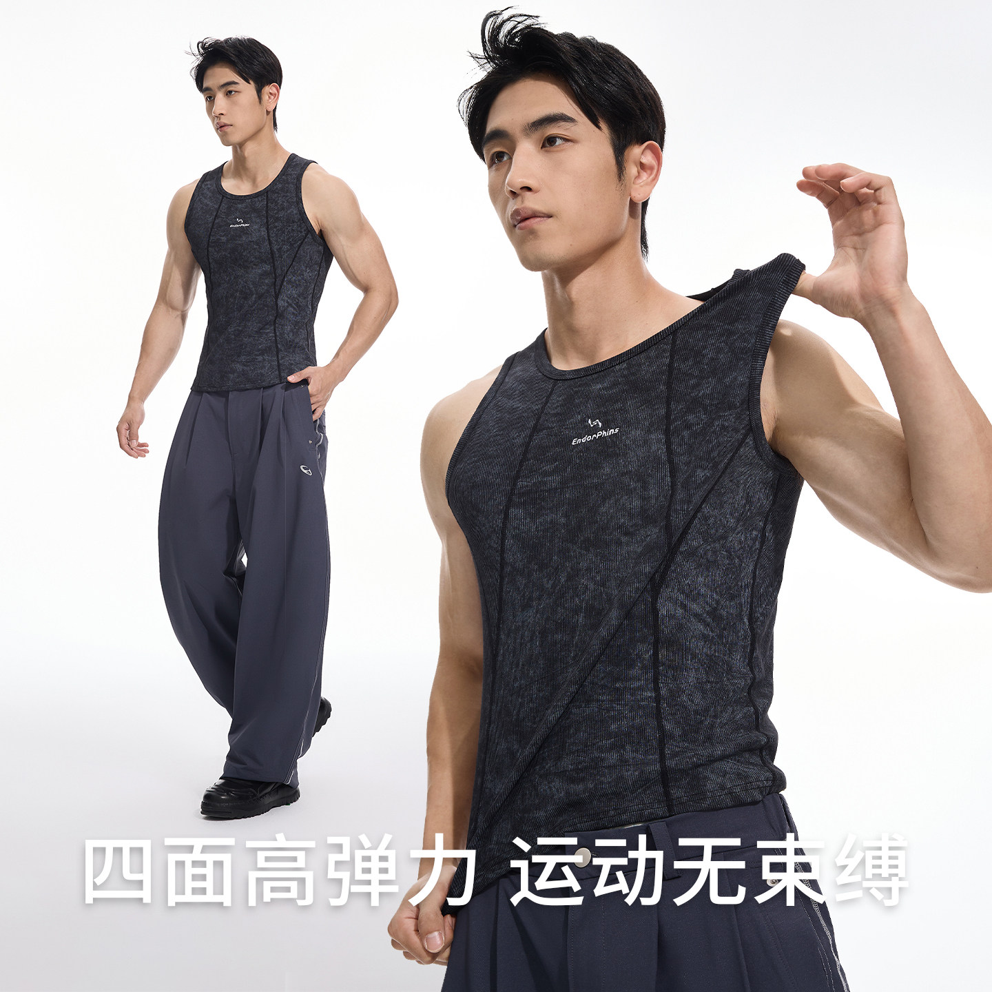 OMG运动 复古蜡染分割线坑条工字运动背心男紧身健身训练圆领无袖