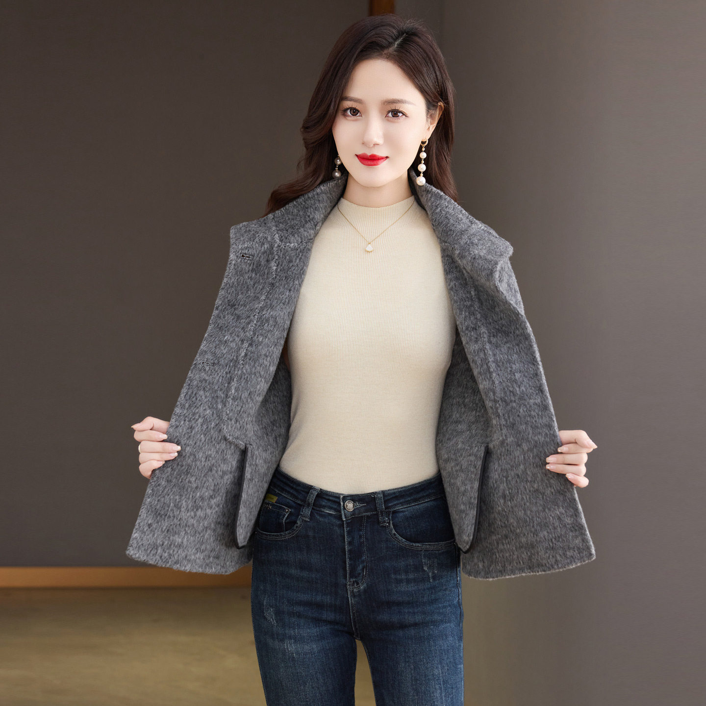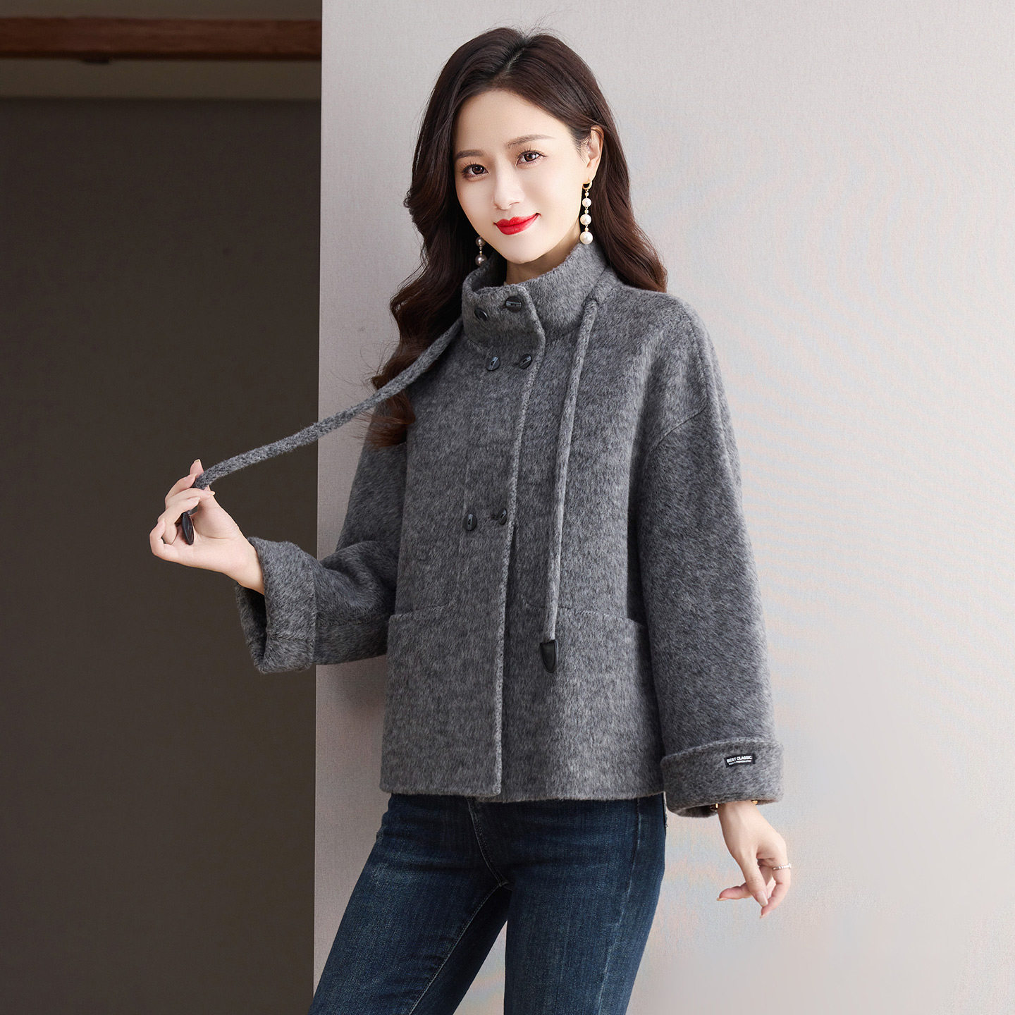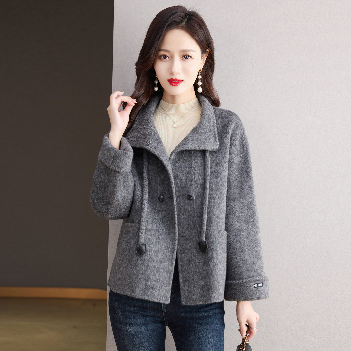 灰色短款小个子双面呢羊绒大衣女2025年新款宽松韩版羊毛呢子外套