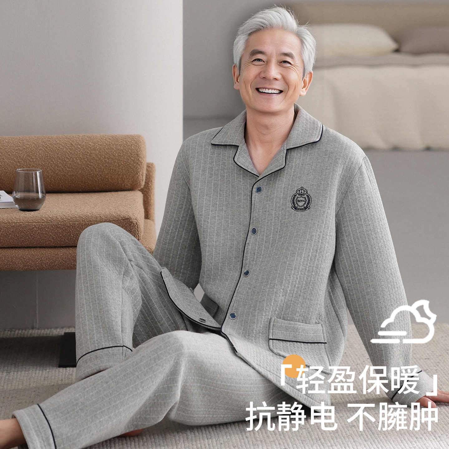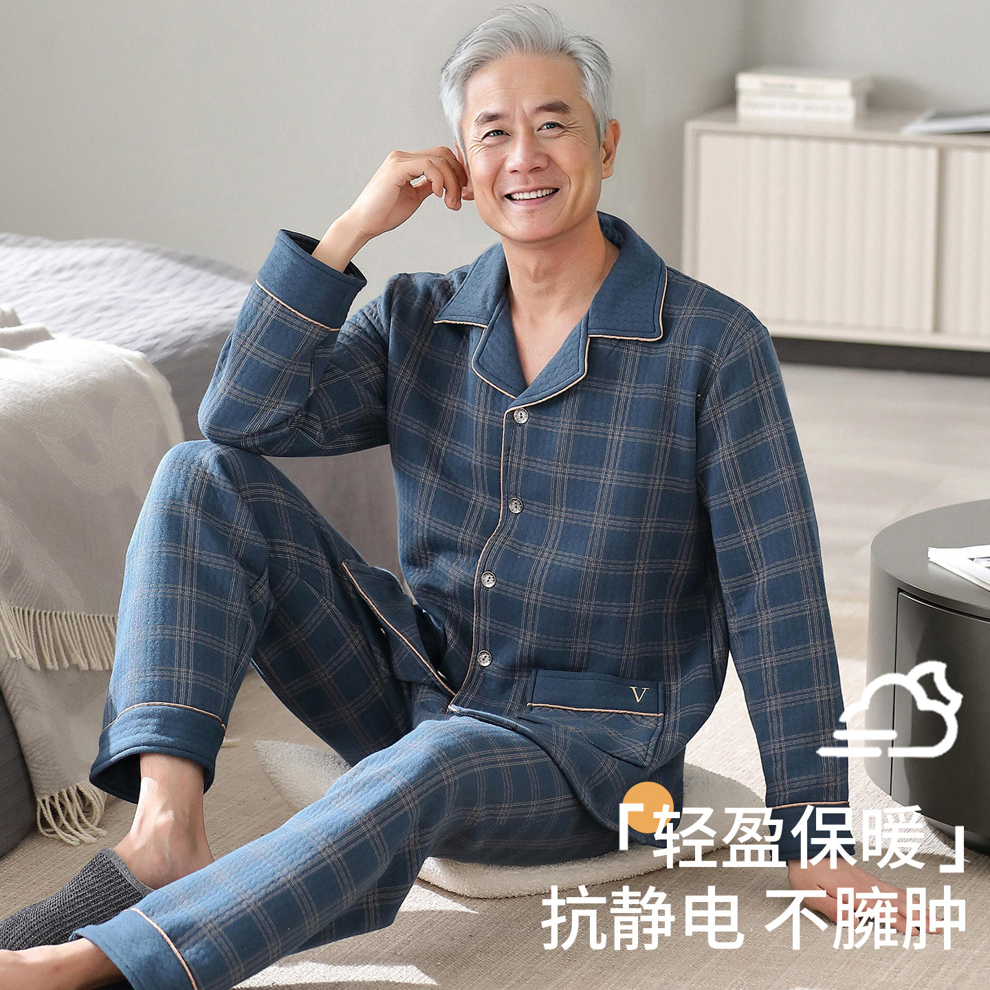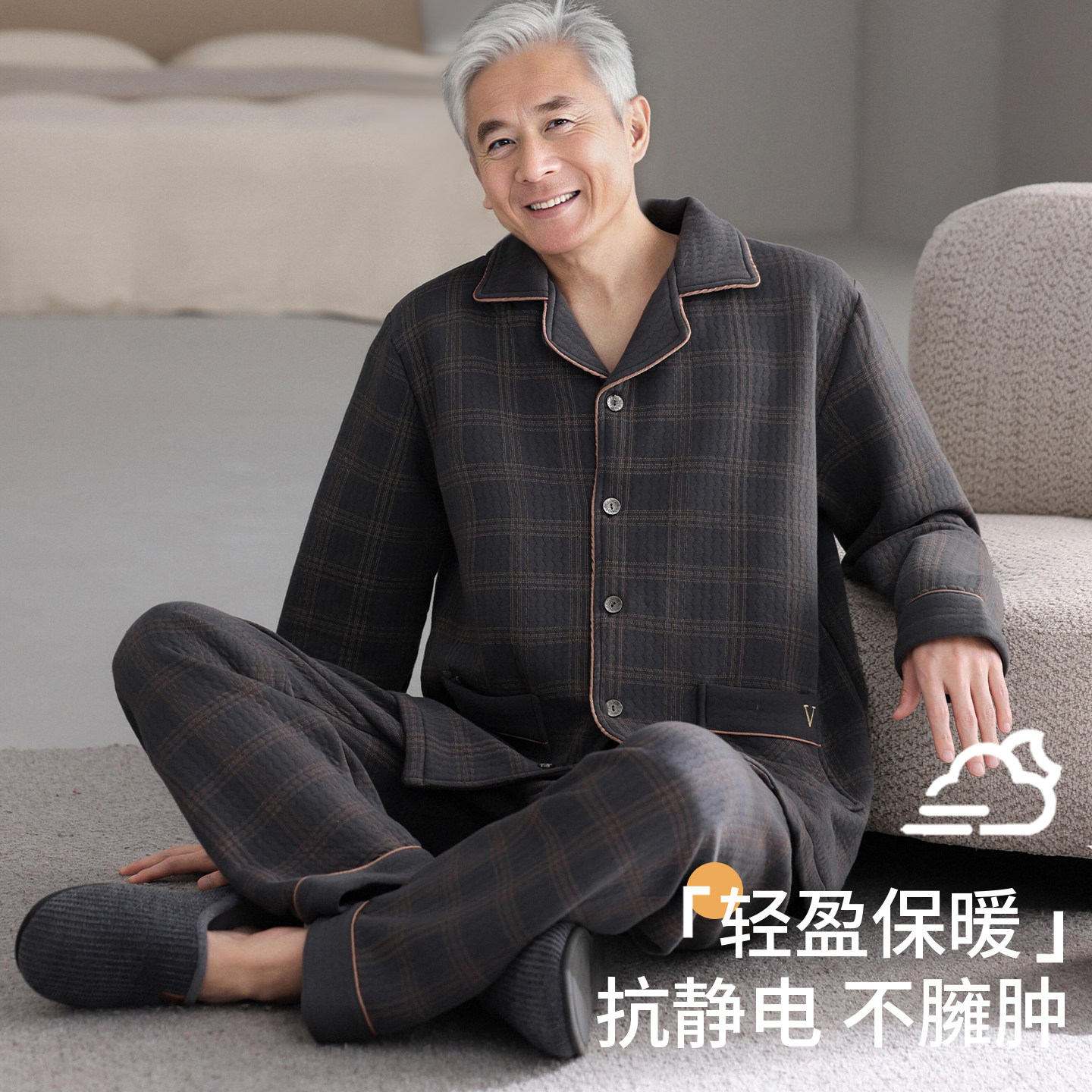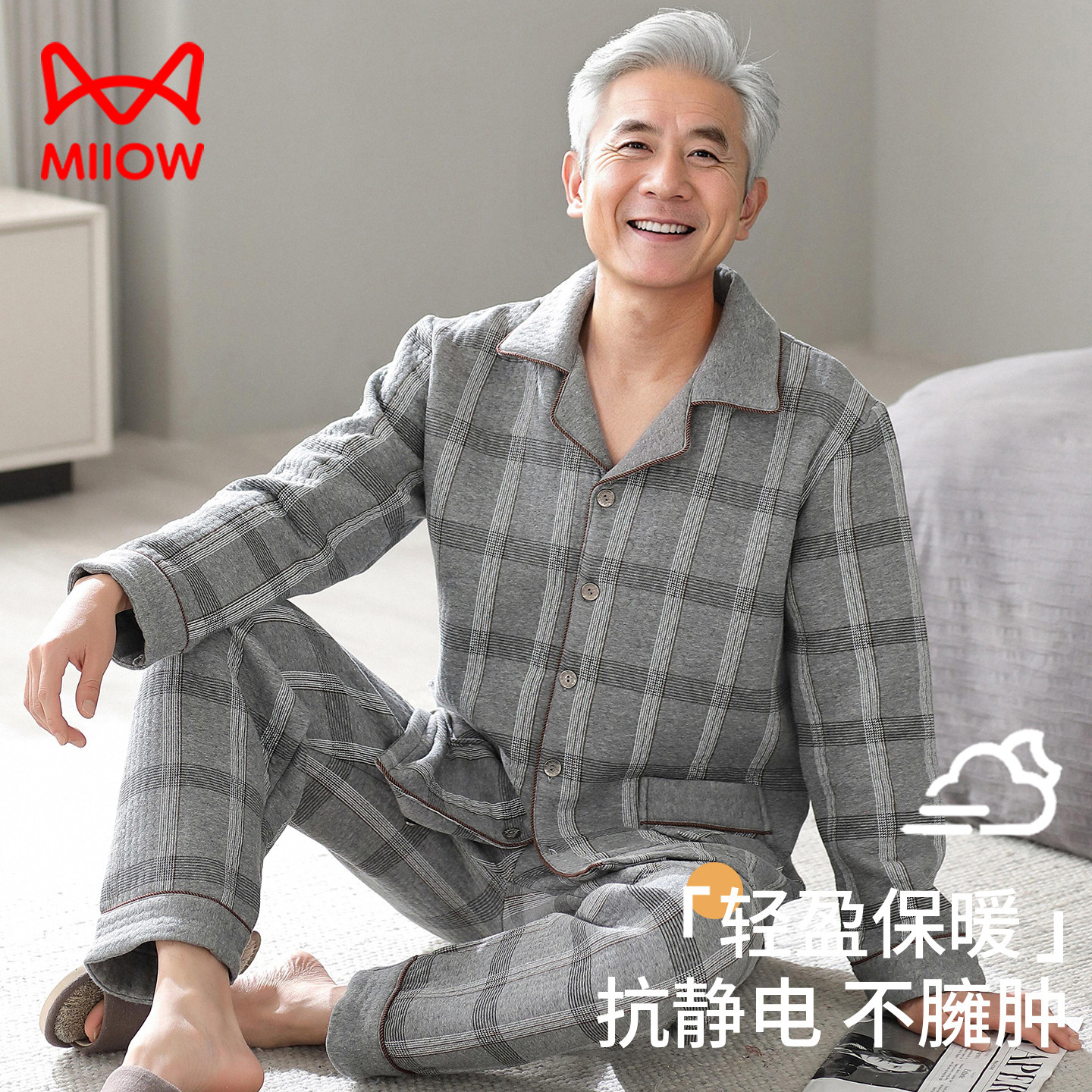猫人睡衣男秋冬加厚纯棉家居服中老年爸爸爷爷全棉夹层套装薄夹棉