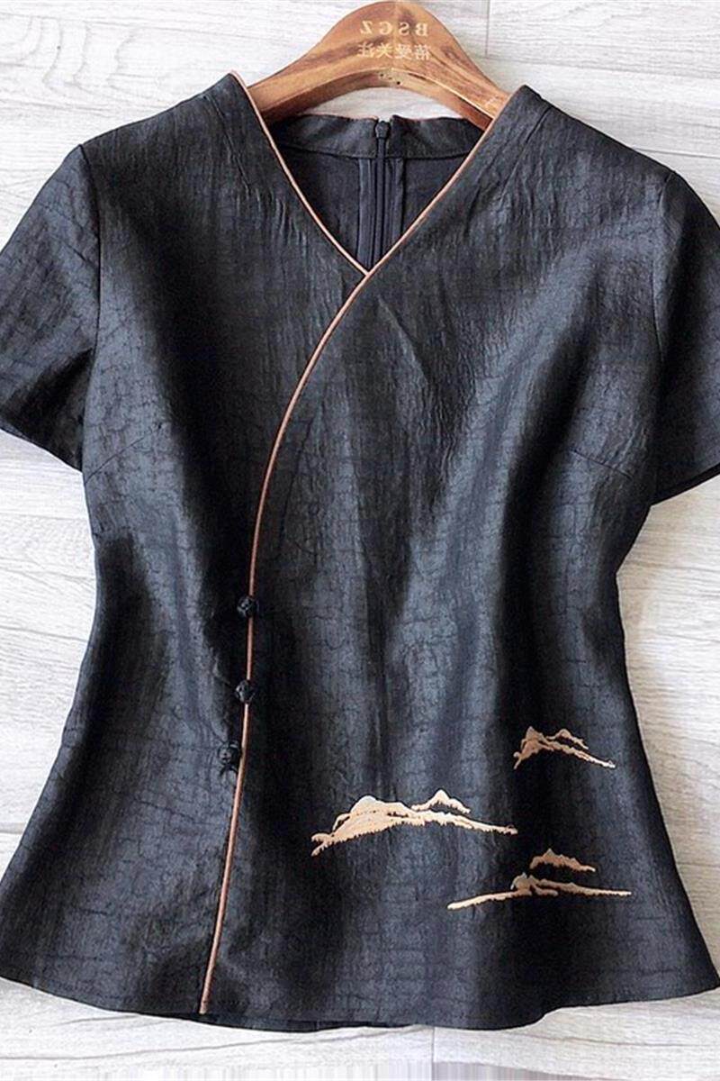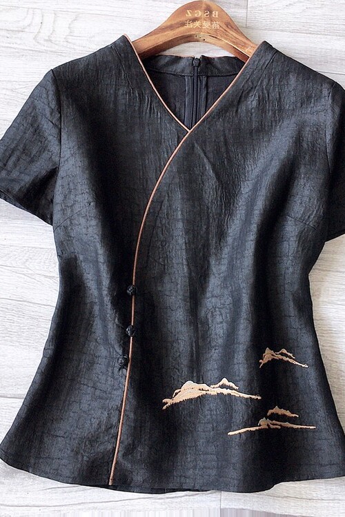 品牌专柜高端女装外贸新中式刺绣龟裂纹真丝香云纱短袖T恤小衫女