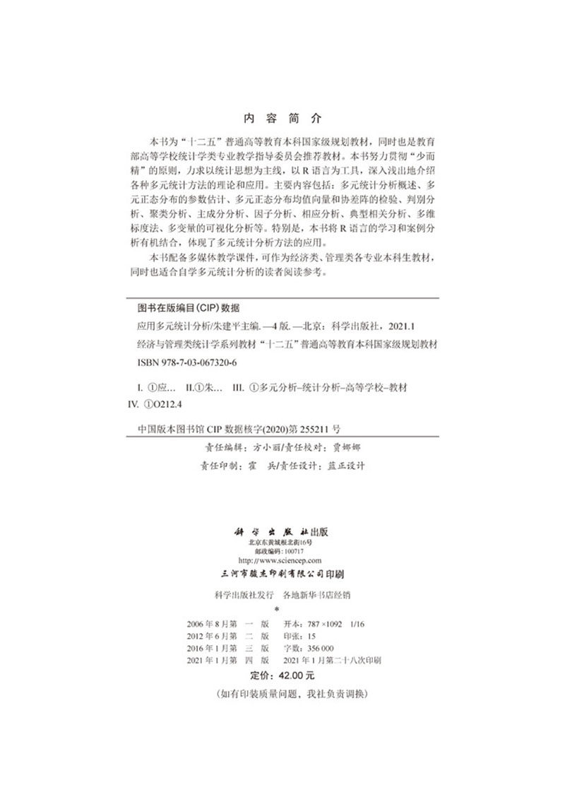 应用多元统计分析第四版朱建平经济与管理类统计学系列教材科学出版社9787030673206