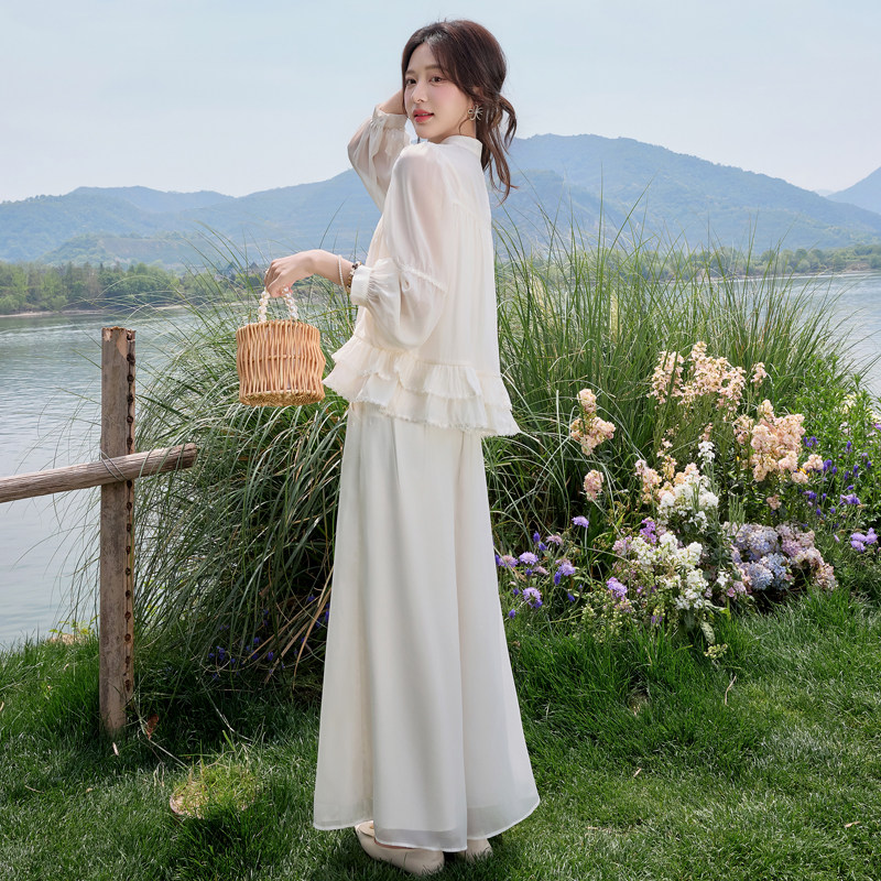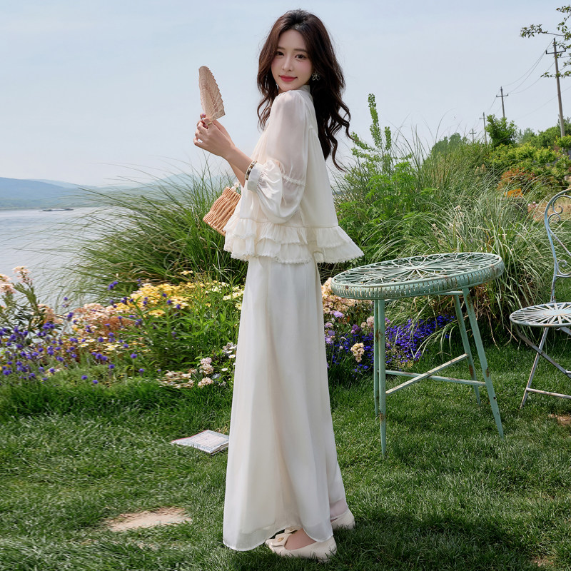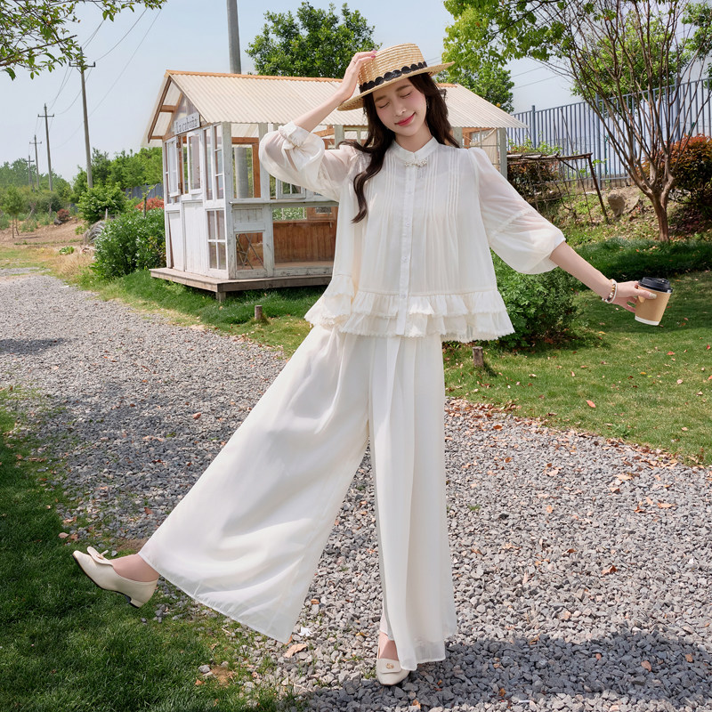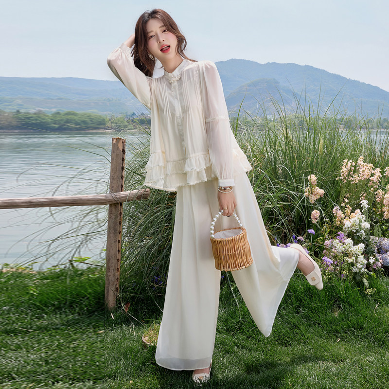 超仙法式长袖衬衫套装女2026夏季新款防晒上衣流行阔腿裙裤两件套