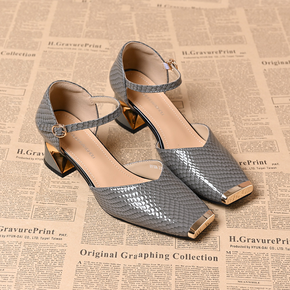 方头浅口粗跟凉鞋女2025年春夏新款法式气质金属百搭中空高跟单鞋