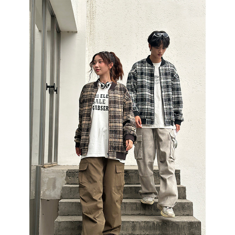 美式复古格子外套男女款2026春秋季新款潮牌宽松休闲情侣夹克上衣