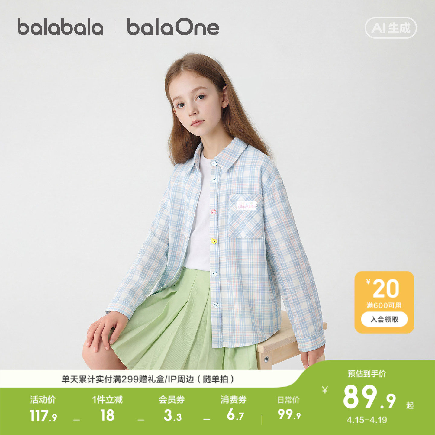 巴拉巴拉童装儿童长袖衬衫女童2026新款春装格子上衣时尚百搭外套