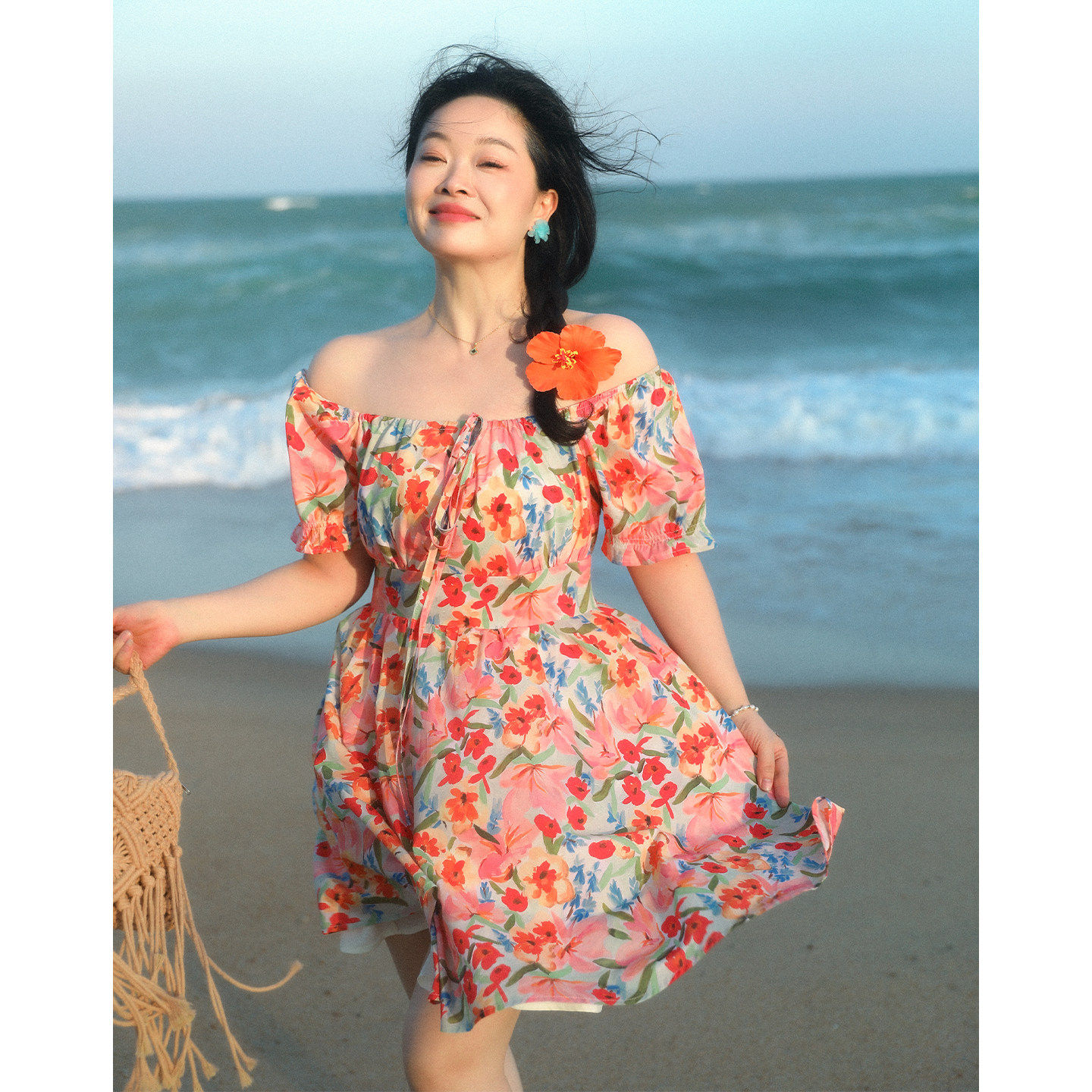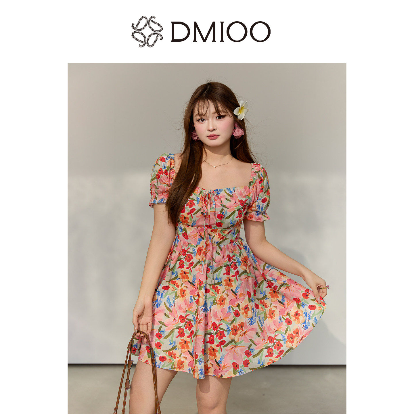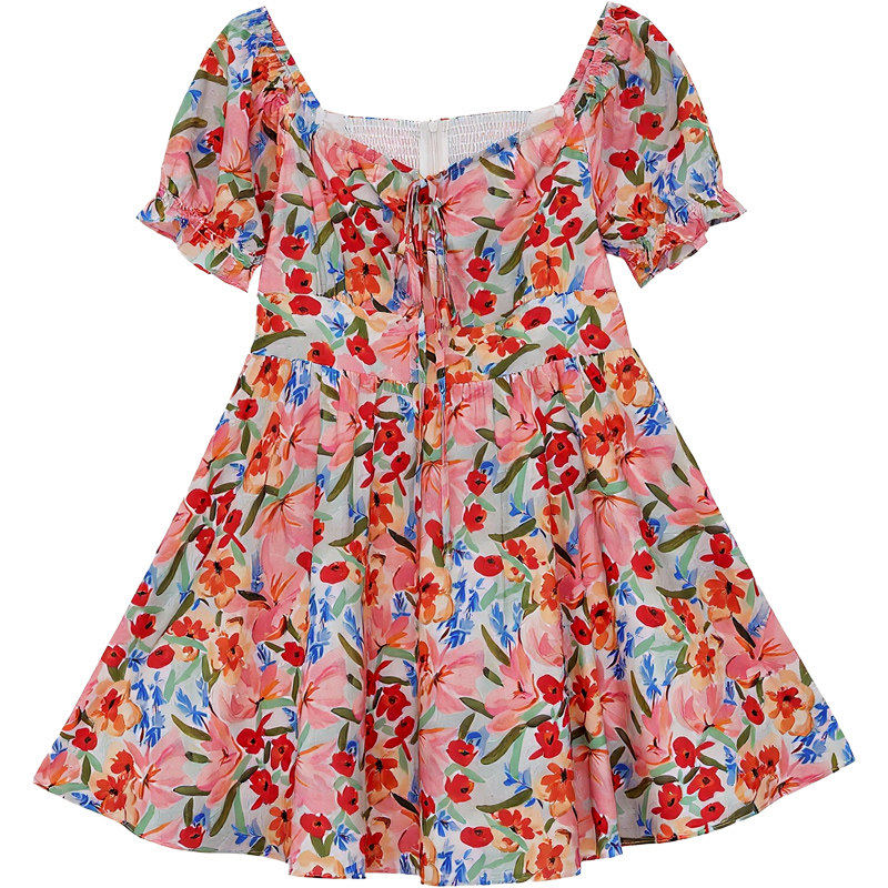 DM100大码女装微胖mm显瘦夏季裙子休闲海边度假风纯棉碎花连衣裙