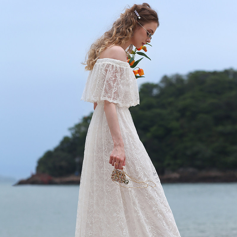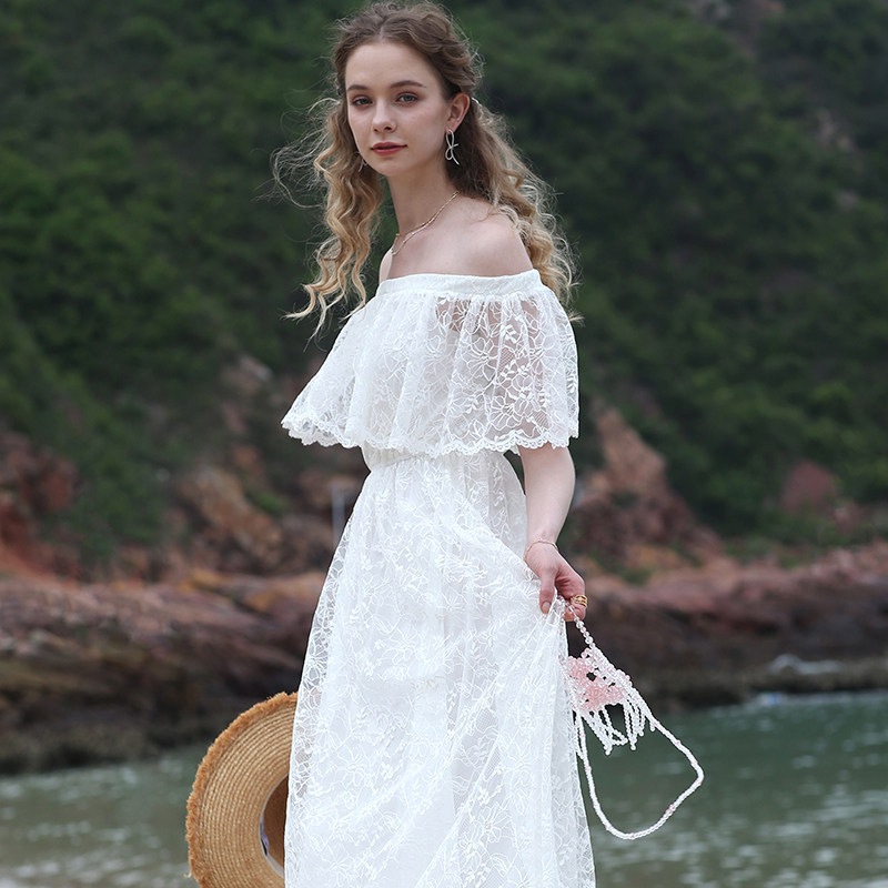 女白色一字肩微胖沙滩连衣裙飘逸仙气法式高级感蕾丝海边度假长裙