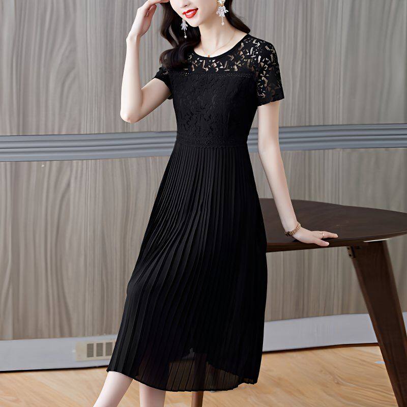大码蕾丝连衣裙女夏装2026新款白色雪纺大摆百褶裙子飘逸仙气长裙