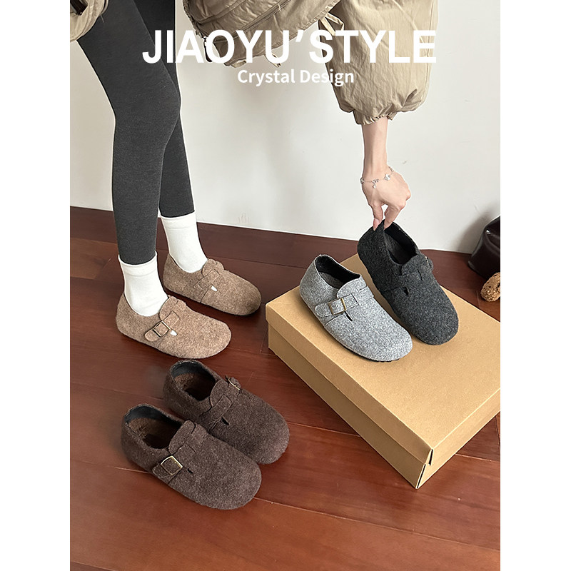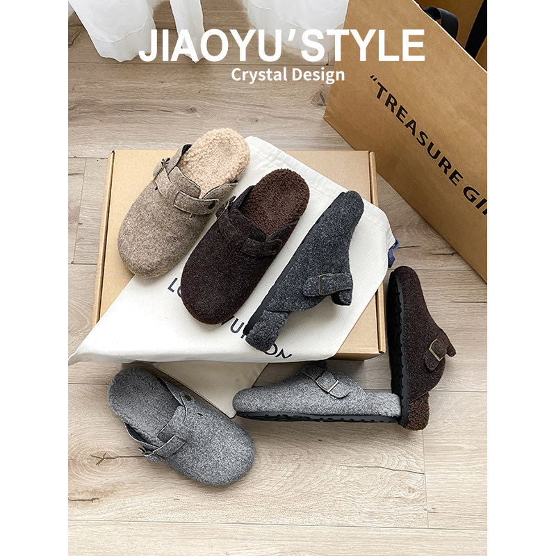 真皮~骄屿厚底勃肯鞋女秋冬新款加绒懒人包头半拖鞋保暖毛毛棉鞋