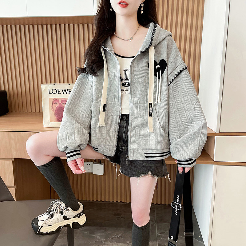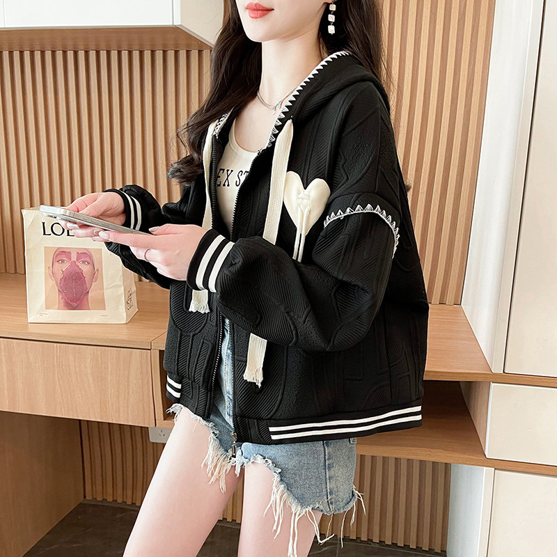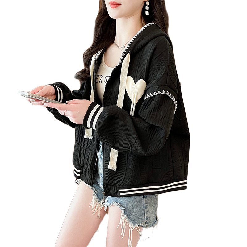 初中生潮流春装外套宽松时尚少女高中学生设计感短款连帽卫衣开衫