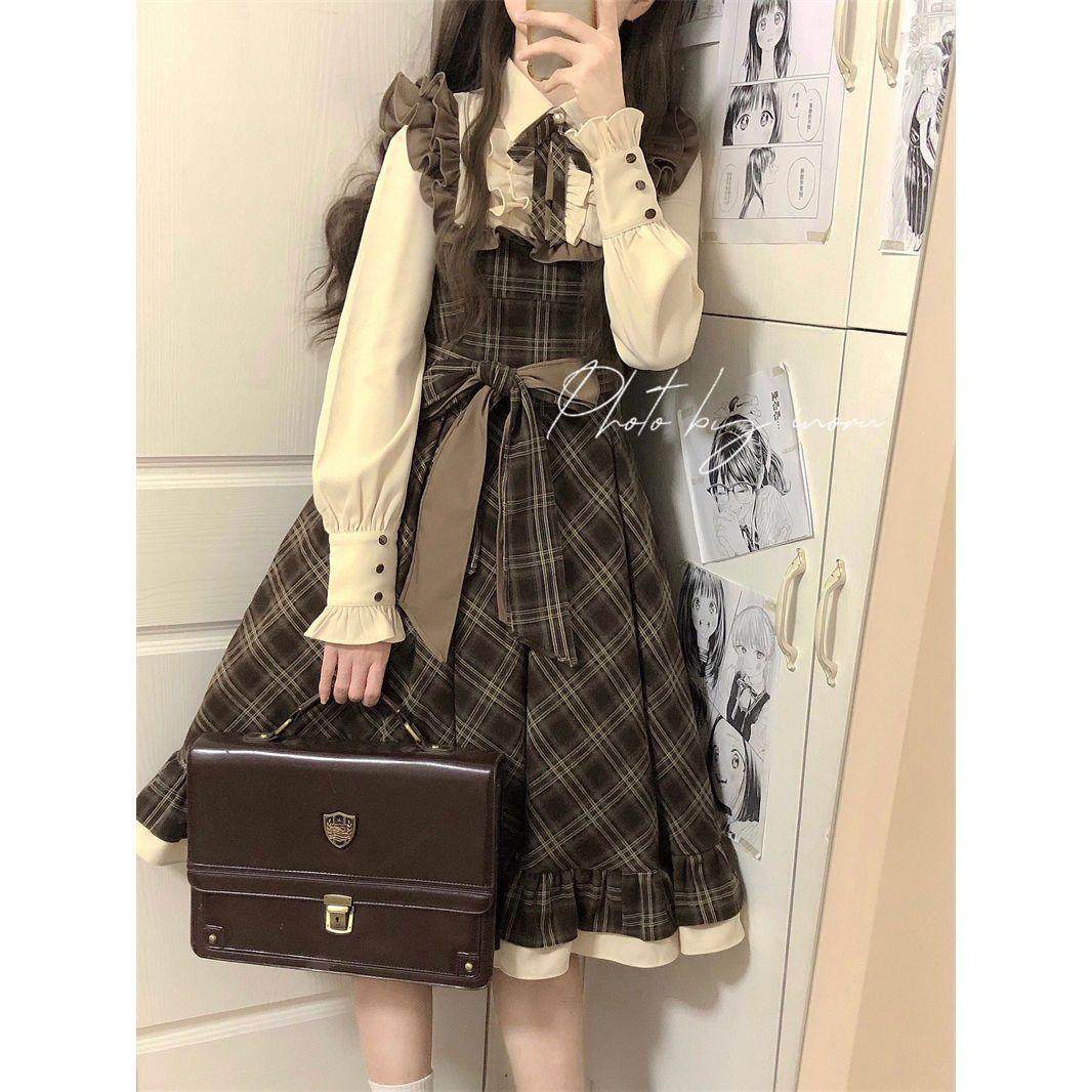 春季日系长袖学院风连衣裙校供感新款假两件公主裙小个子洋气裙子