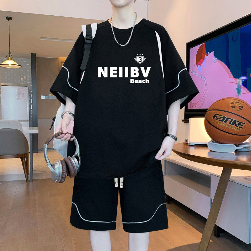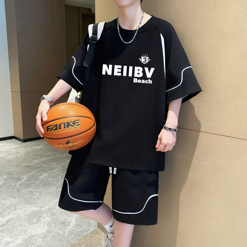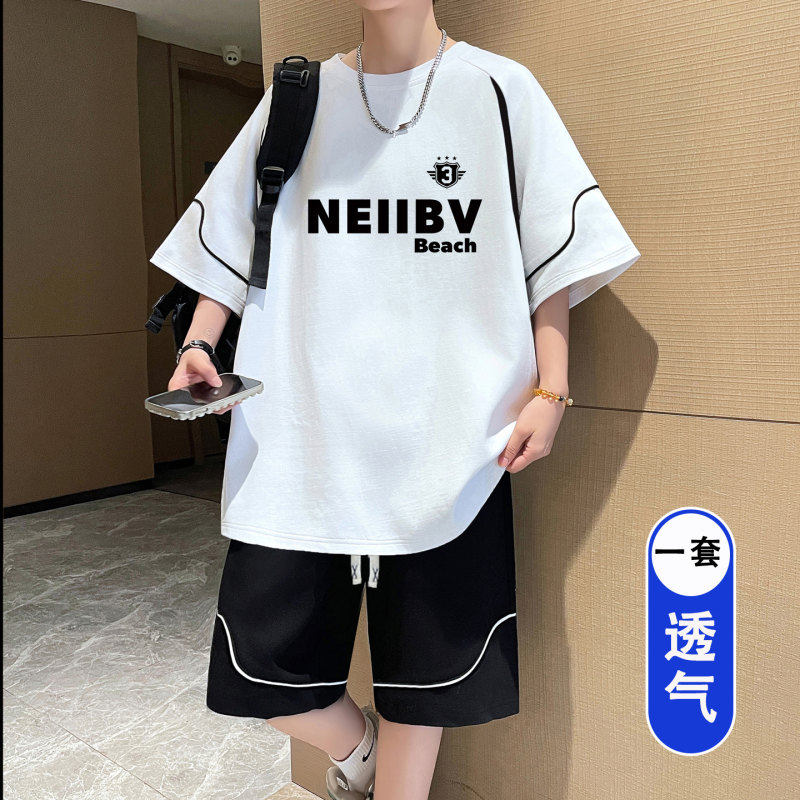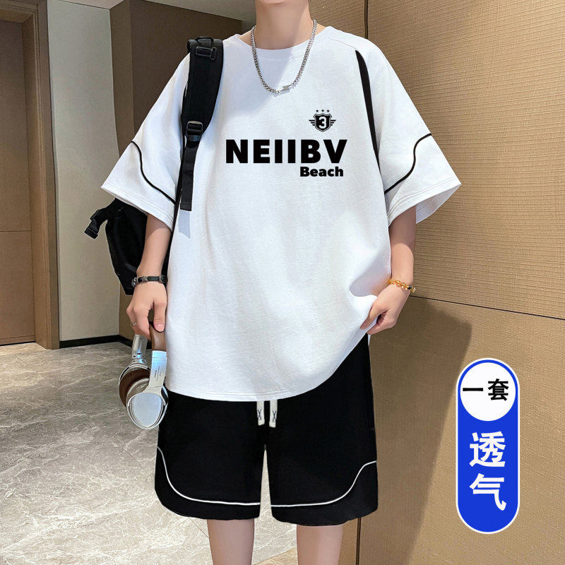 夏季青少年纯棉港风短袖t恤套装男装休闲运动初高中学生帅气衣服