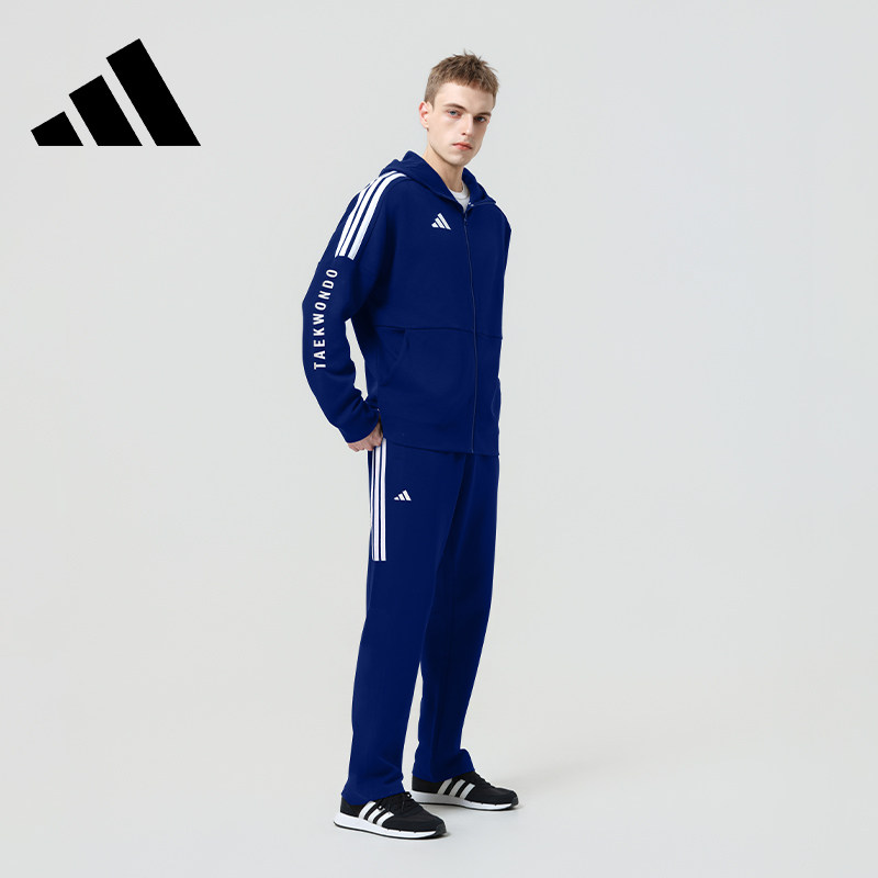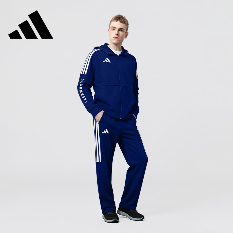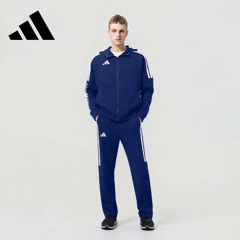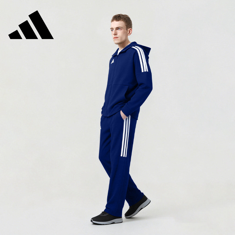 adidas阿迪达斯男士套装藏蓝色经典三条杠运动连帽外套长裤两件套