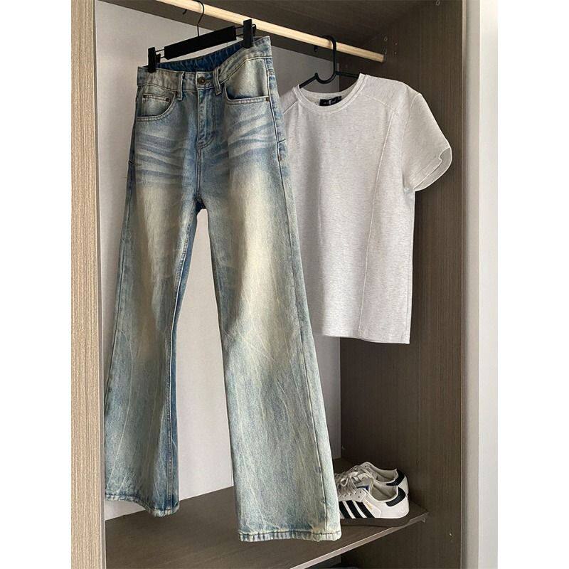 ykee浅蓝色微喇牛仔裤男女款春季美式高街显瘦裤子cleanfit直筒裤