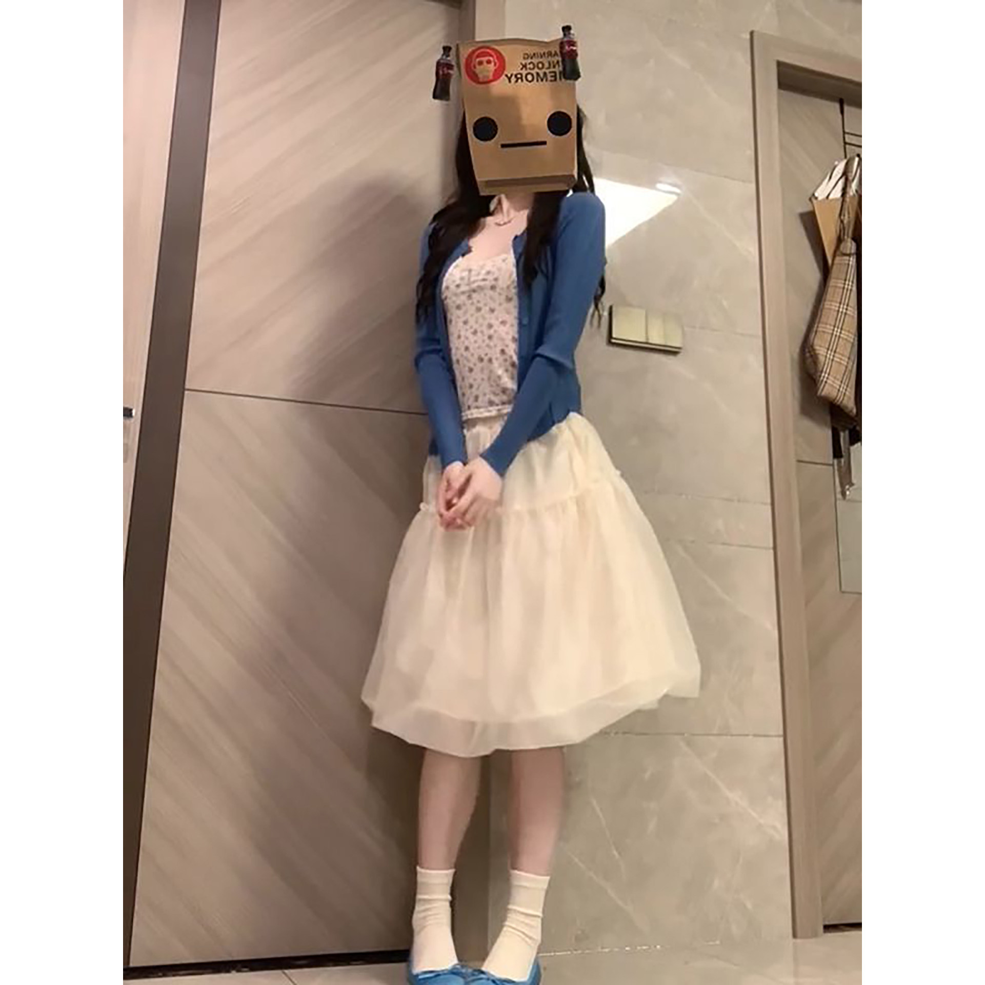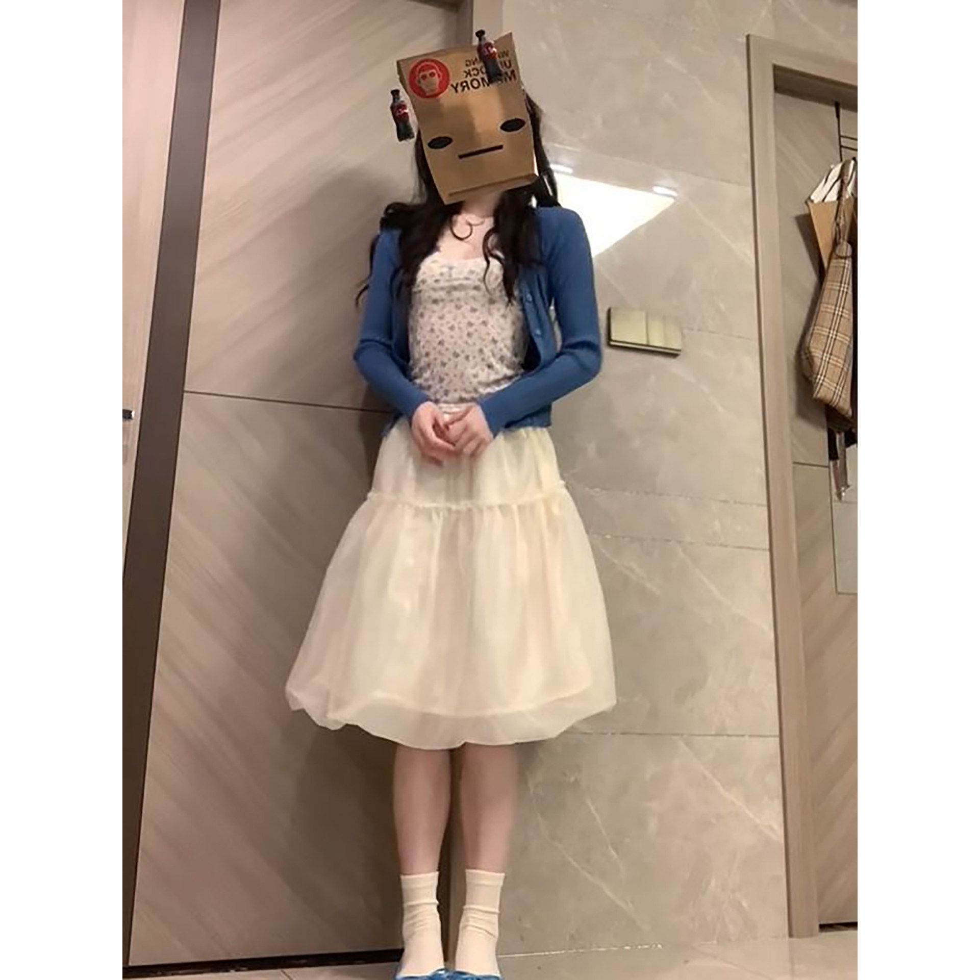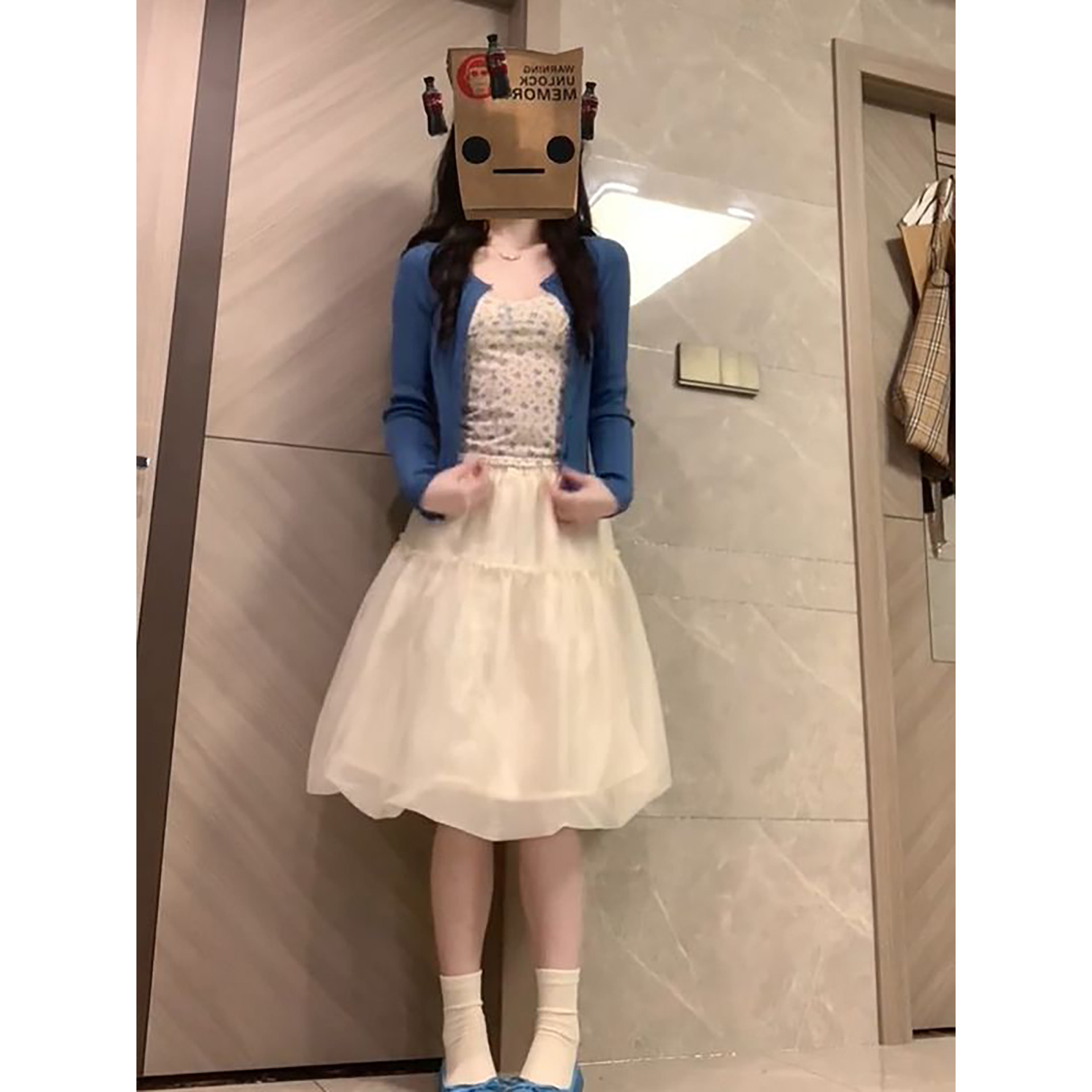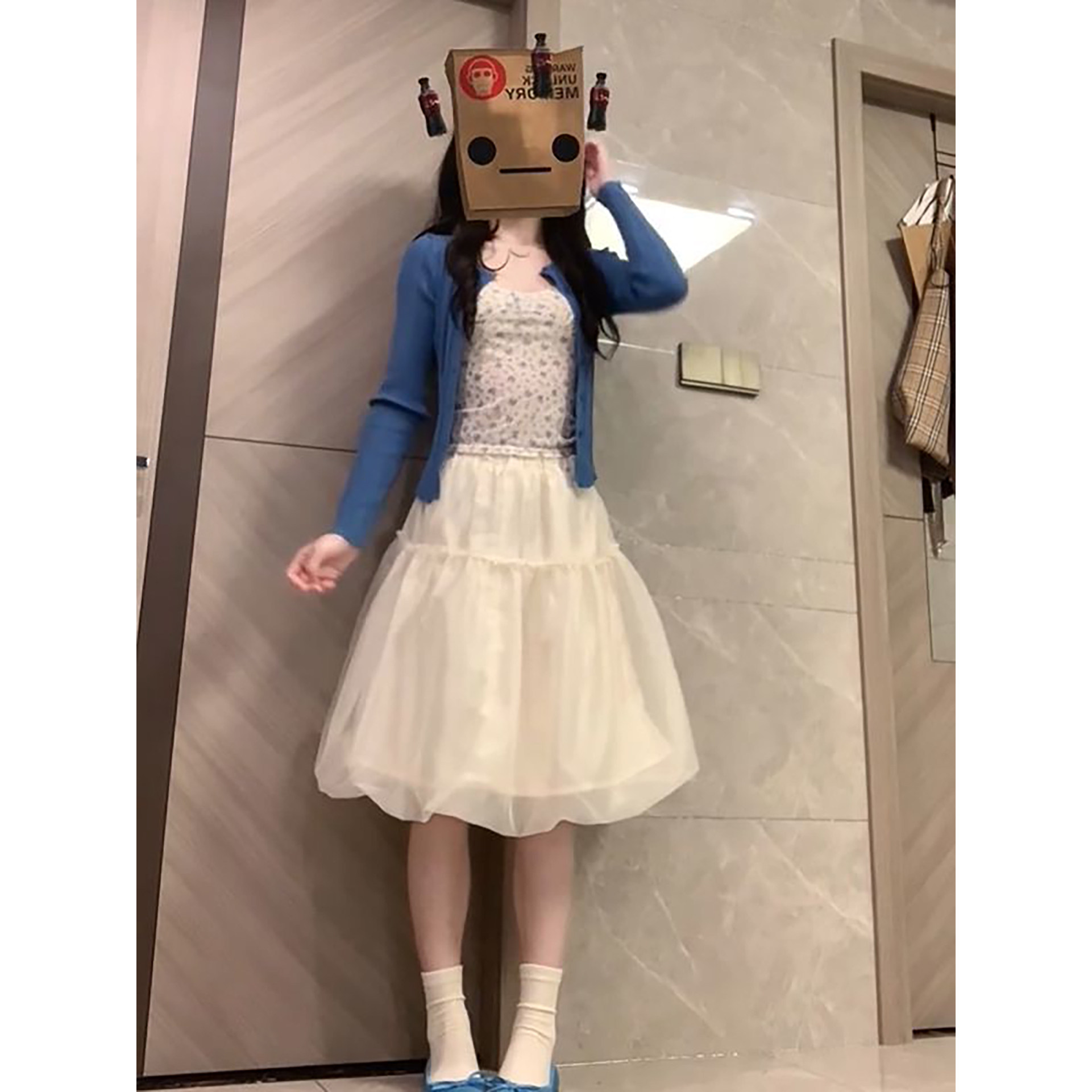 法式小个子温柔学院漂亮蓝色开衫+碎花吊带上衣+花苞长裙三件套装