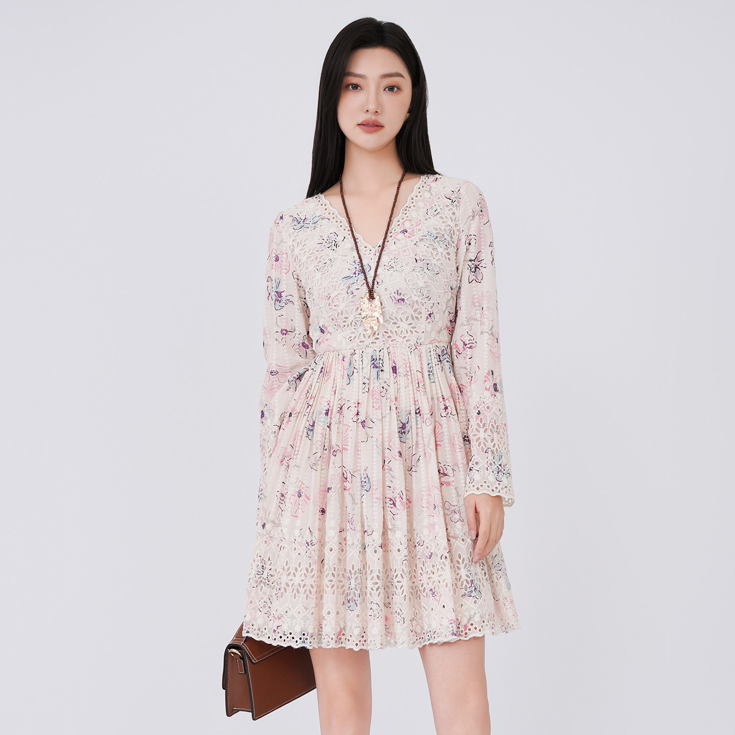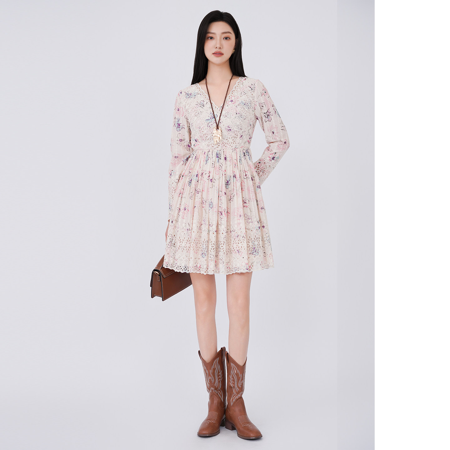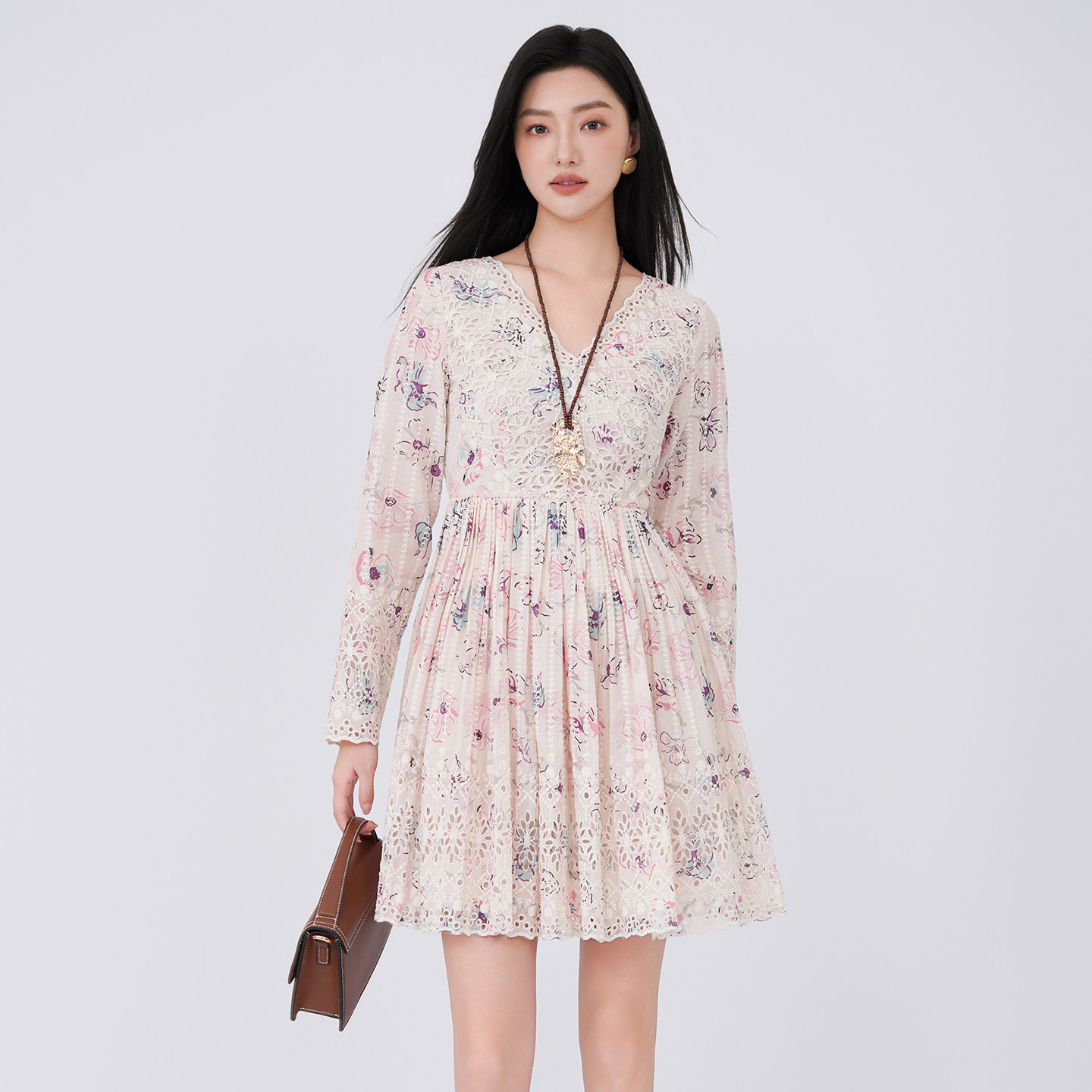 蜜澳连衣裙2026春季长袖法式甜美蕾丝V领重工印花小众裙子