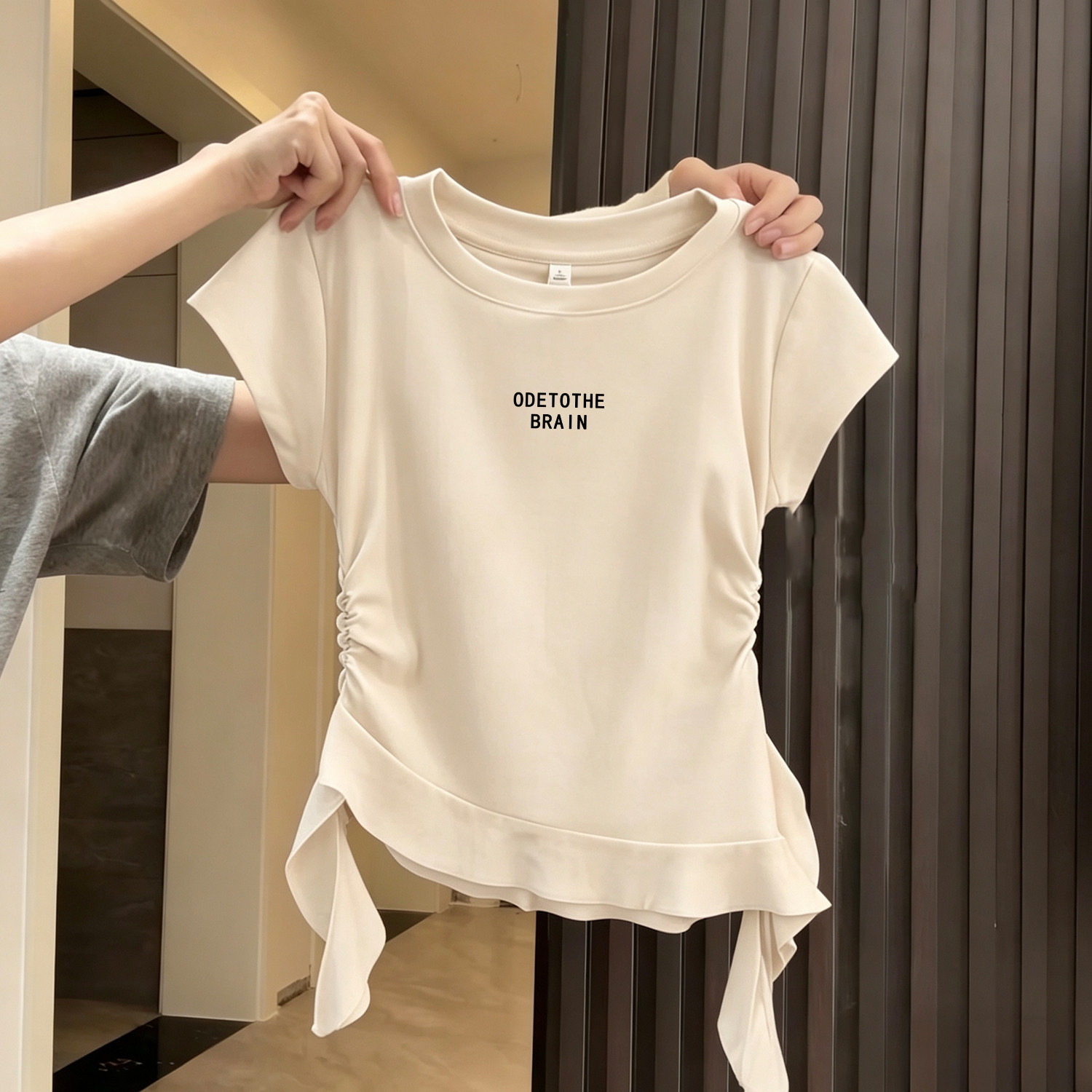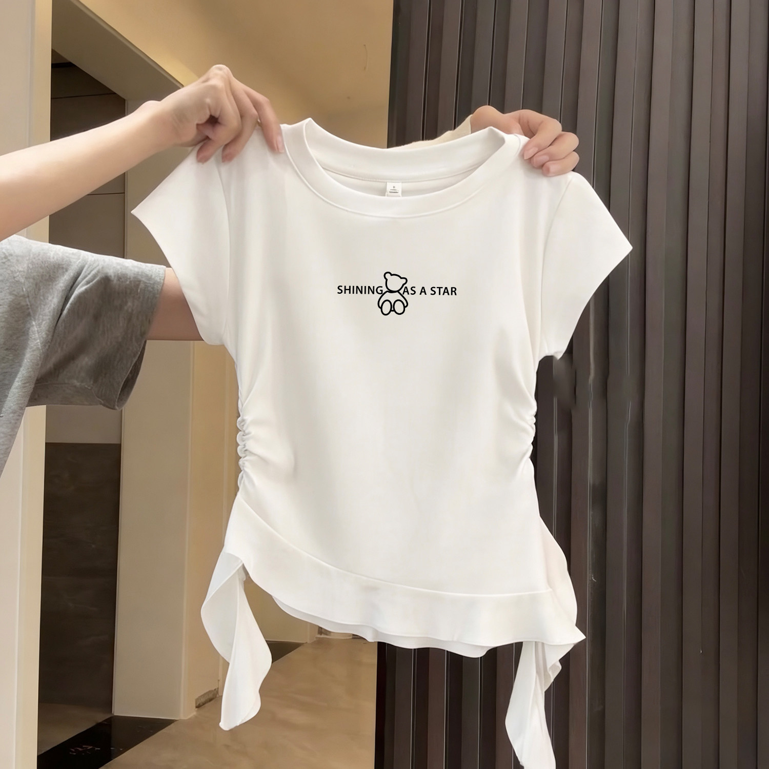 女童夏装2026新款白色圆领纯棉短袖t恤短款儿童荷叶边不规则上衣