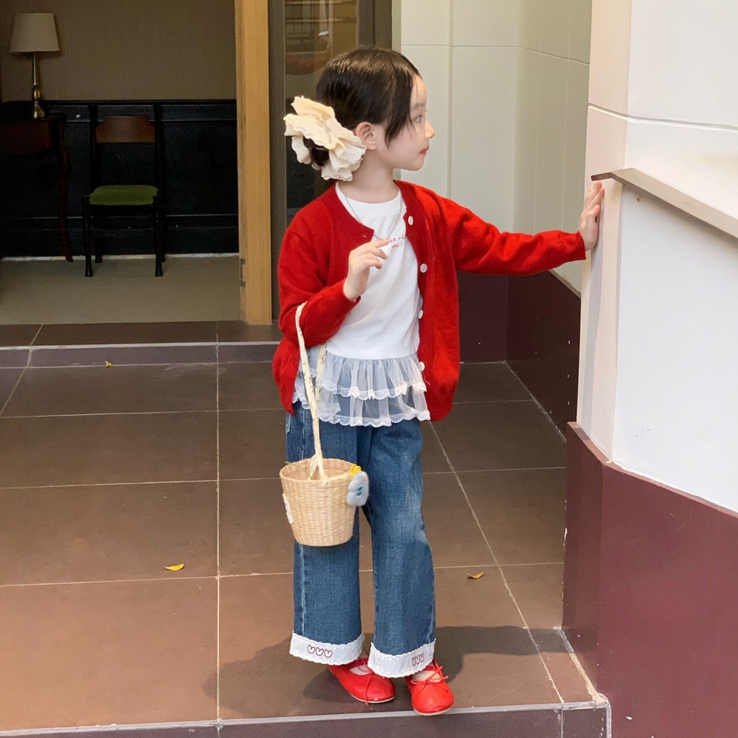 女童针织开衫外套春装新款儿童洋气时髦上衣女宝宝春季牛仔裤套装