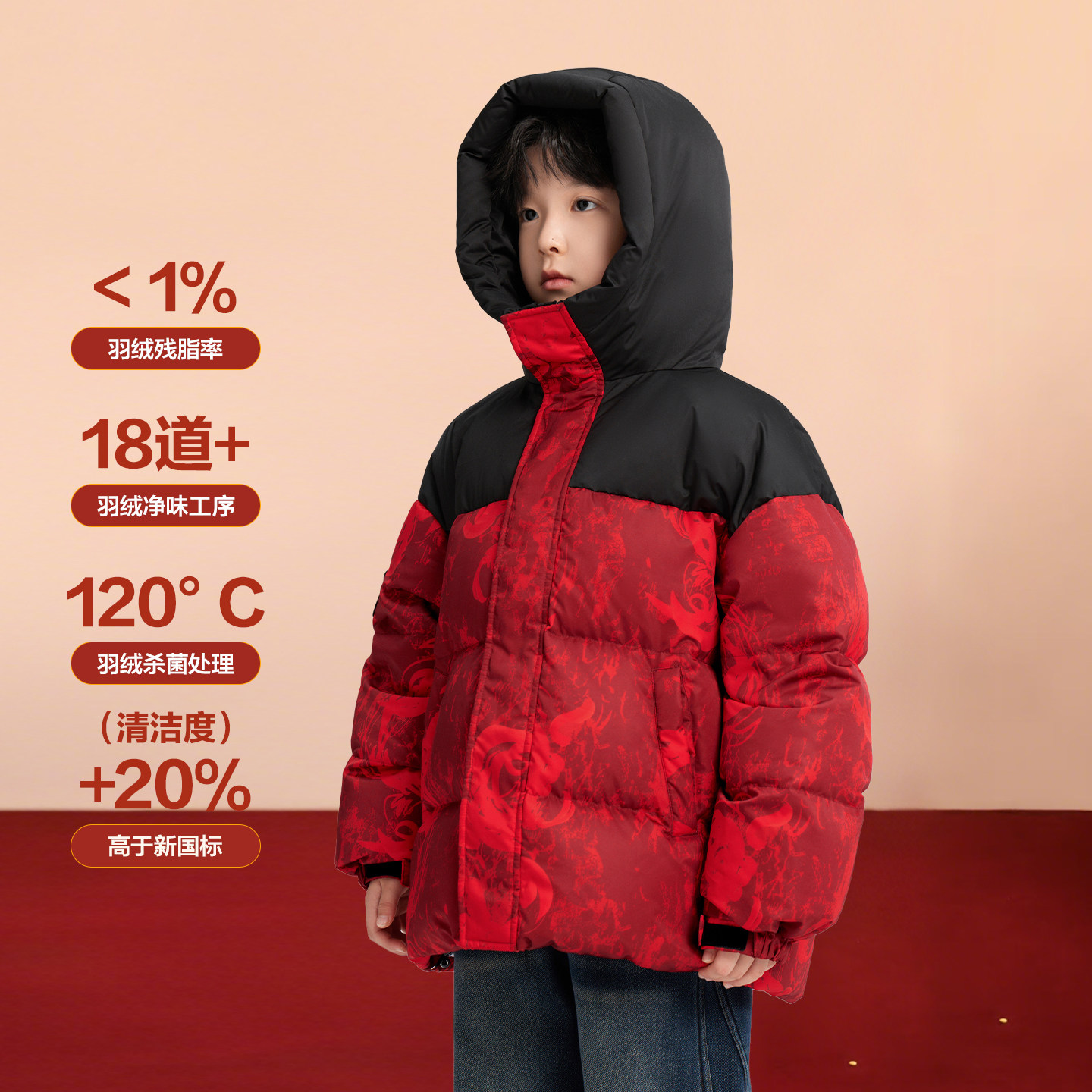 左西童装男童红色羽绒服冬季加厚拜年服2026新款儿童连帽新年外套