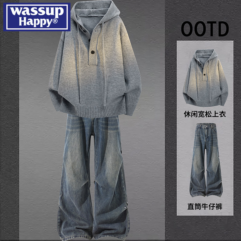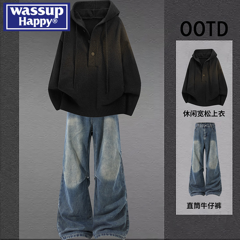 wassup happy连帽针织毛衣外套男秋冬季新款青少年帅气穿搭一整套