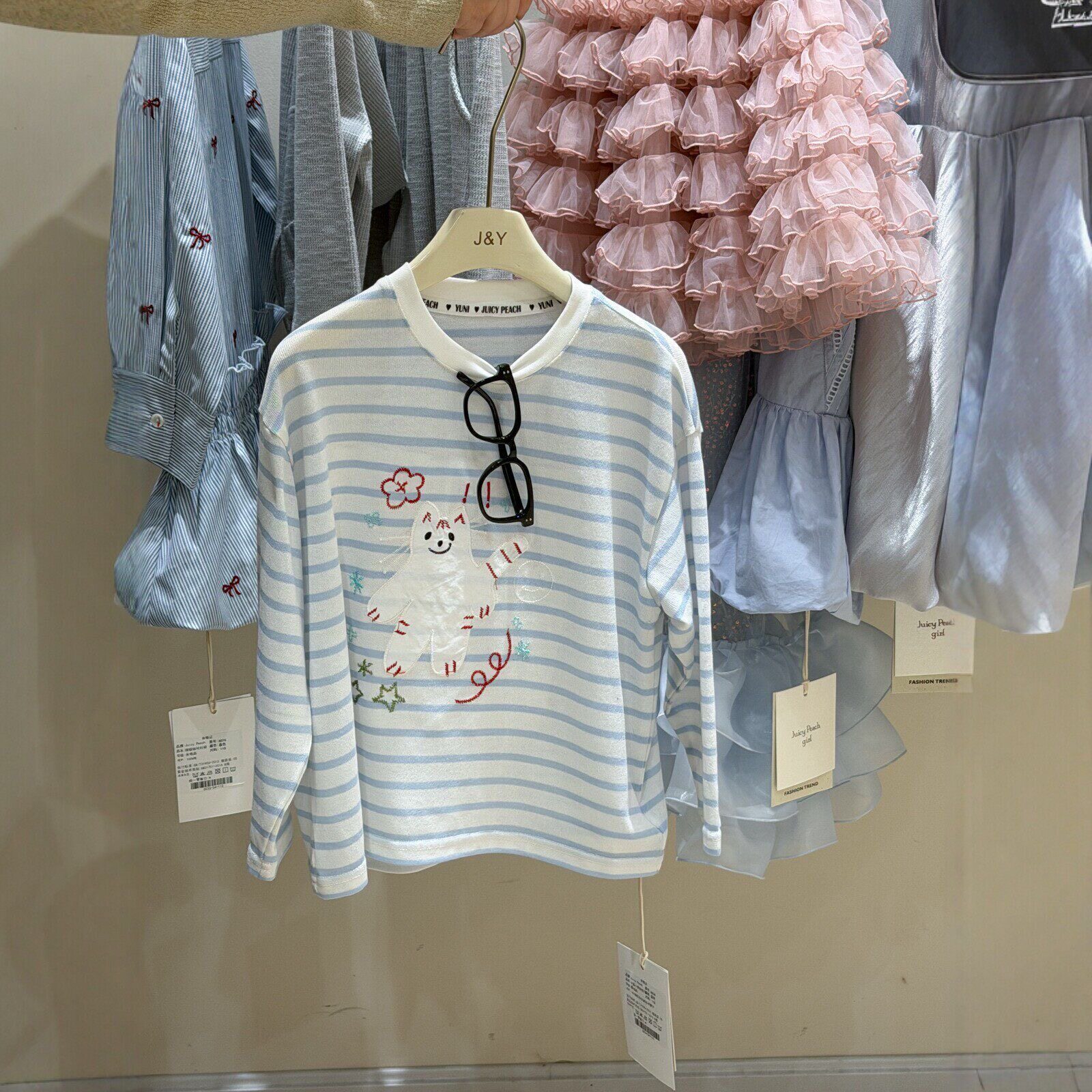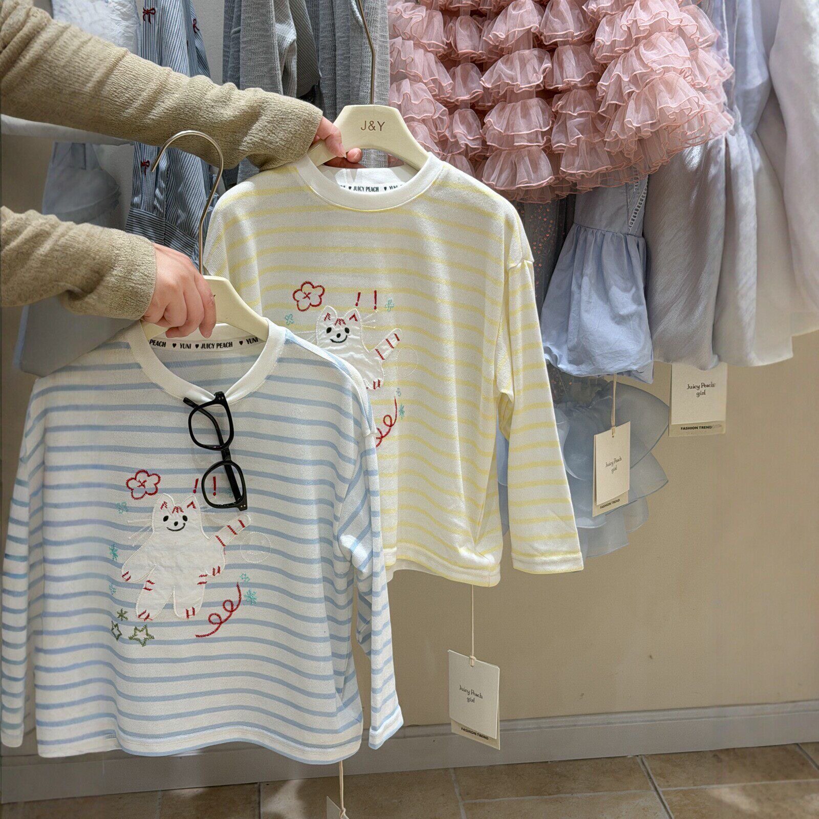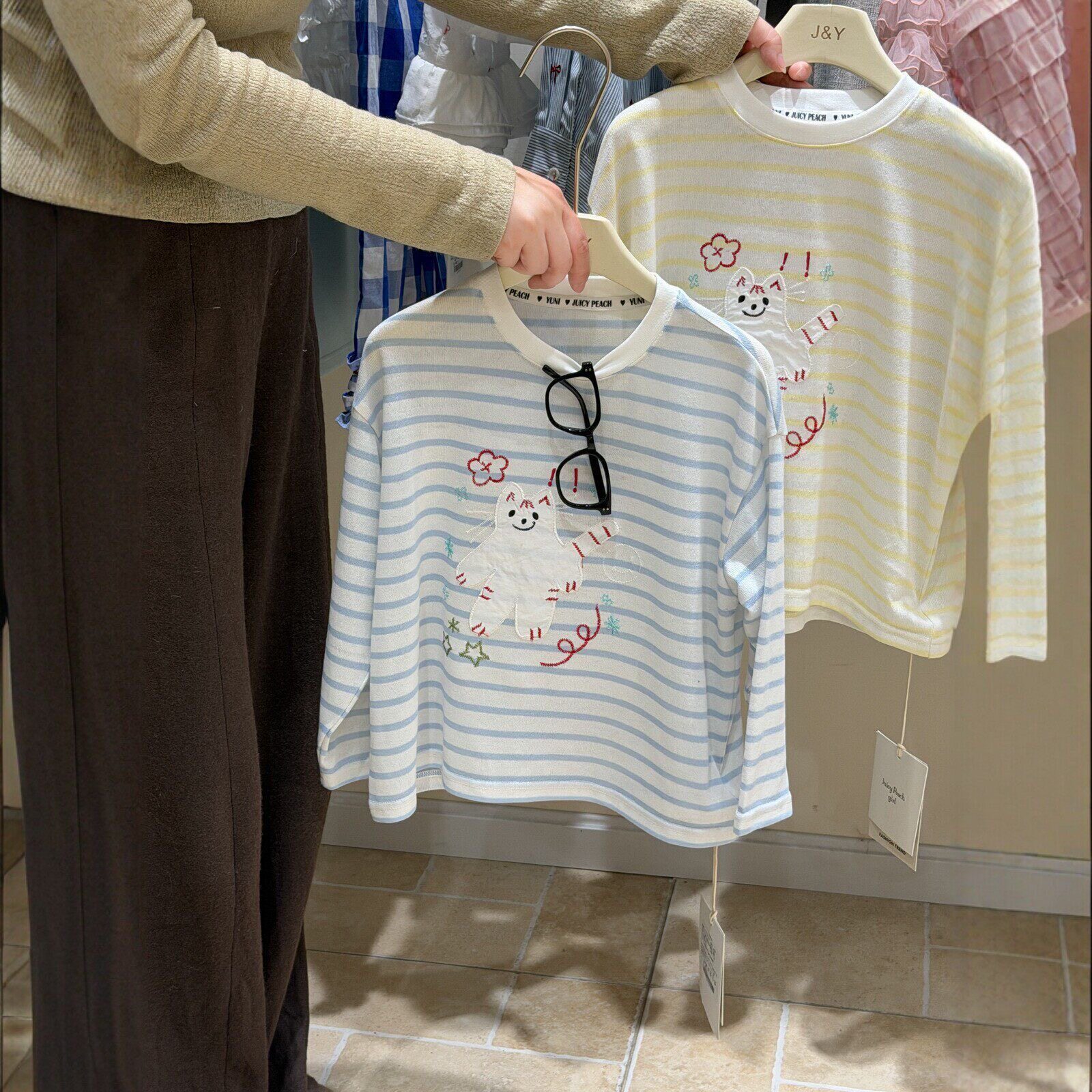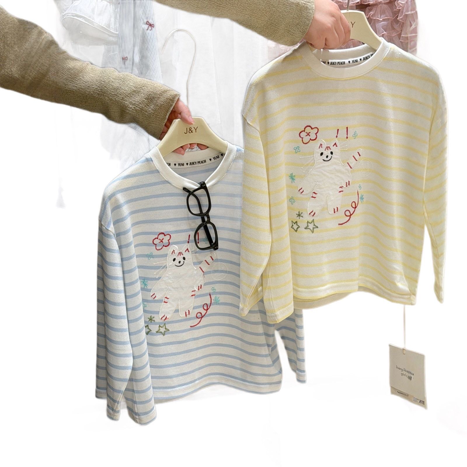 2026新款女童韩版条纹刺绣猫咪长袖T恤春款洋气百搭卡通上衣薄款