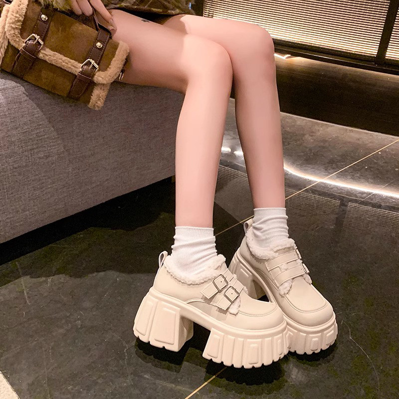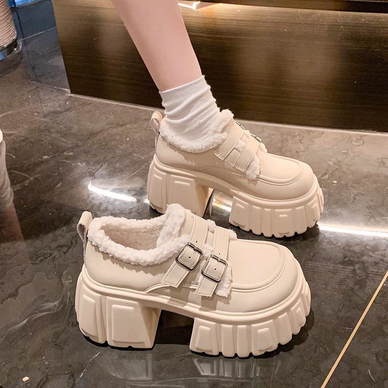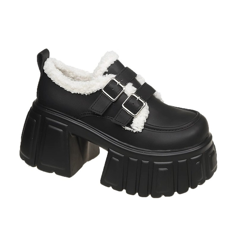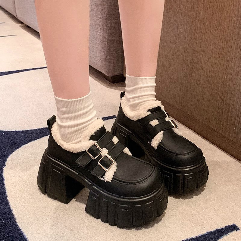 羊羔毛毛小皮鞋女11cm小个子内增高厚底休闲玛丽珍加绒保暖防滑冬