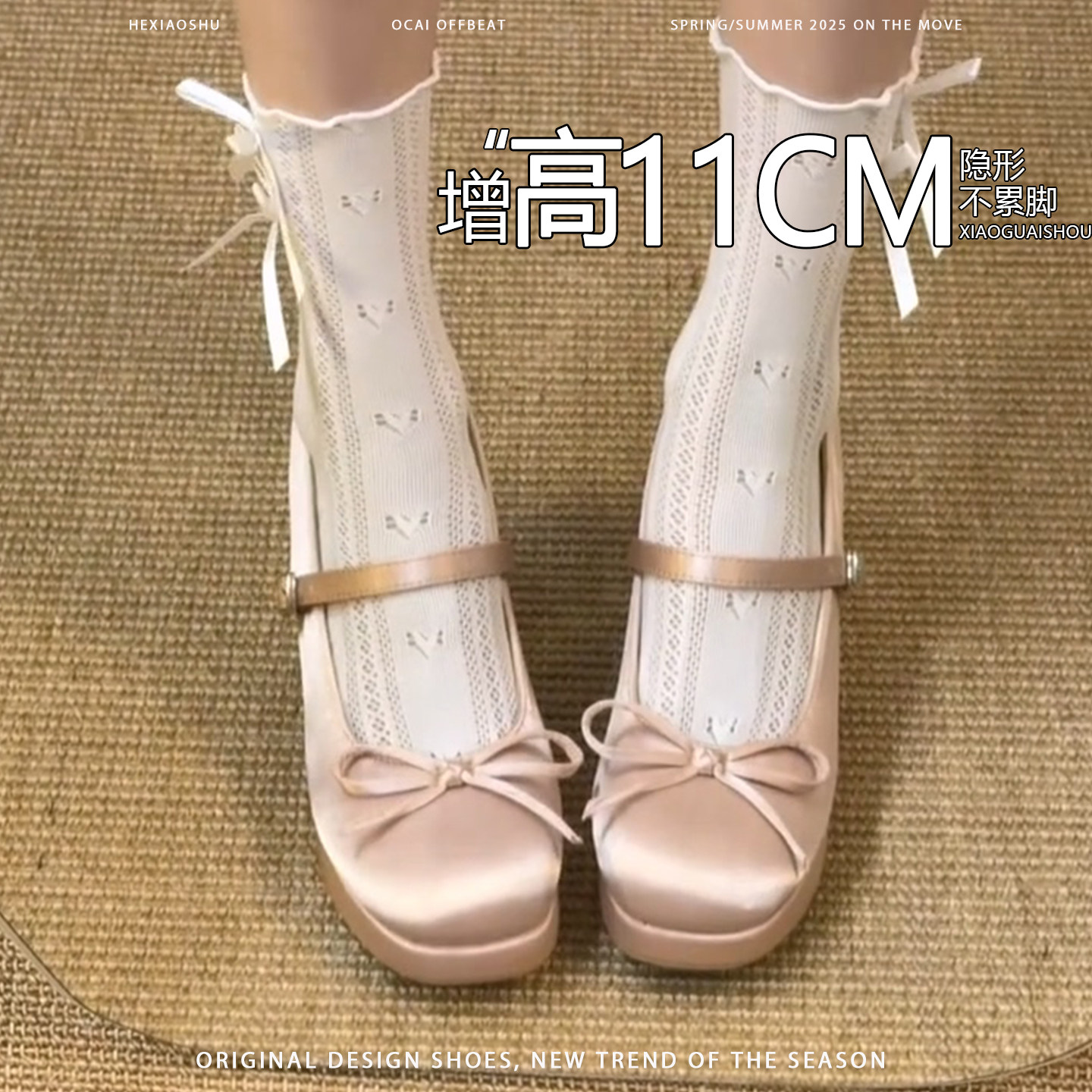 内增高11CM蝴蝶结绸缎玛丽珍鞋女2026新款粗跟圆头一字带百搭单鞋