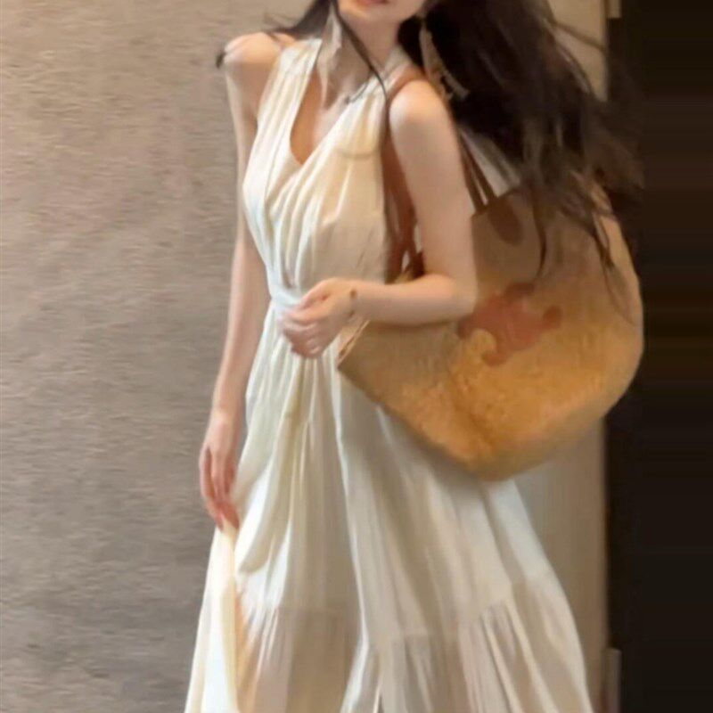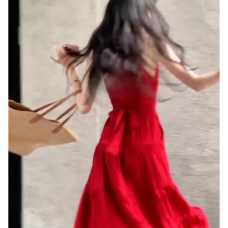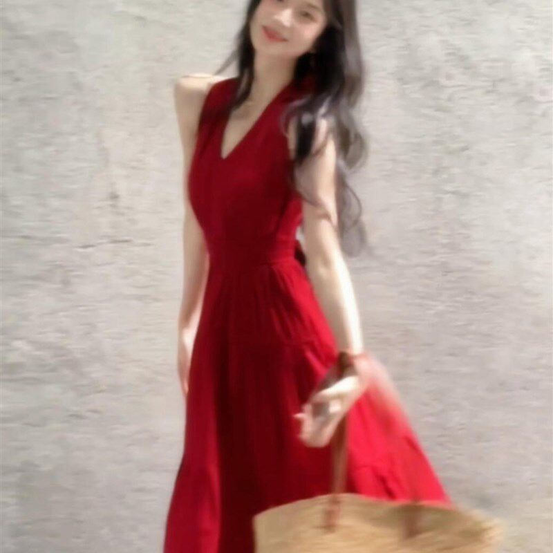 法式气质红色挂脖吊带连衣裙女夏季2025新款海边度假绝美漂亮长裙