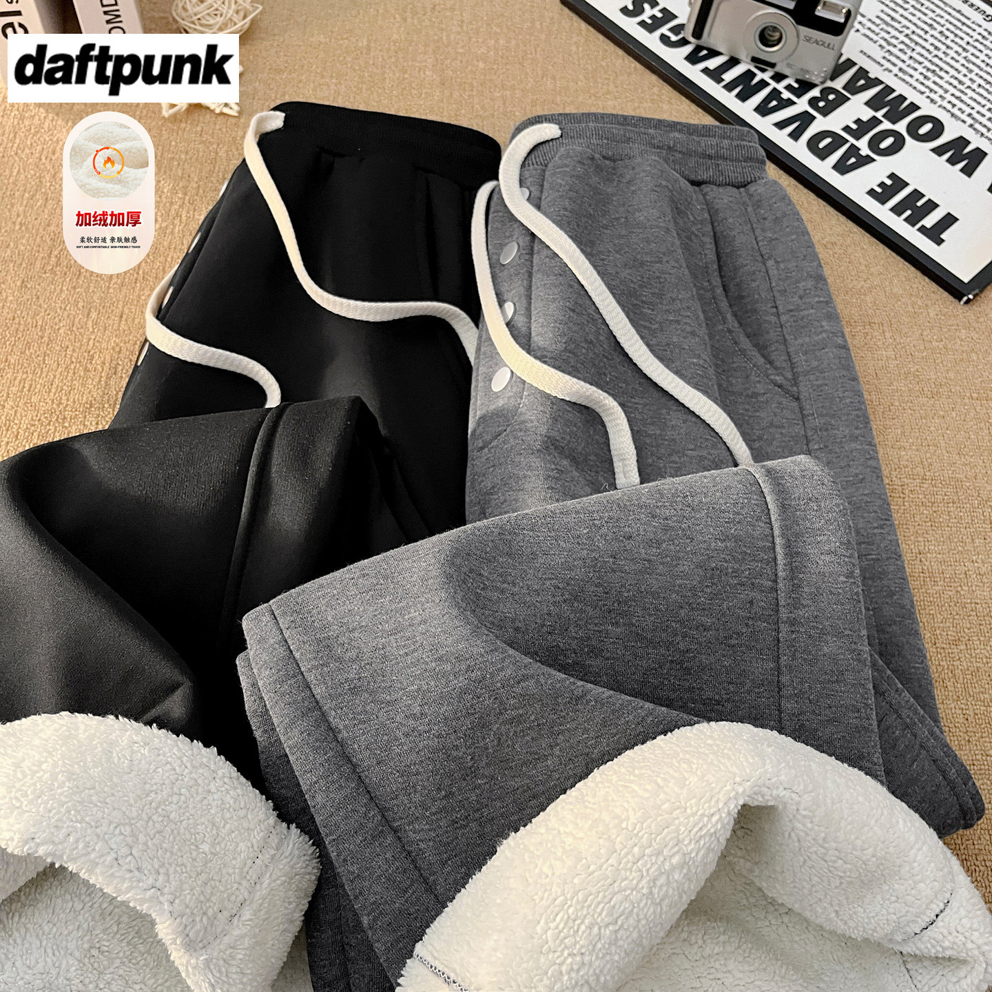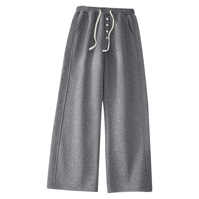 深灰色纽扣加绒卫裤男冬季加厚宽松直筒休闲裤子潮牌青少年运动裤
