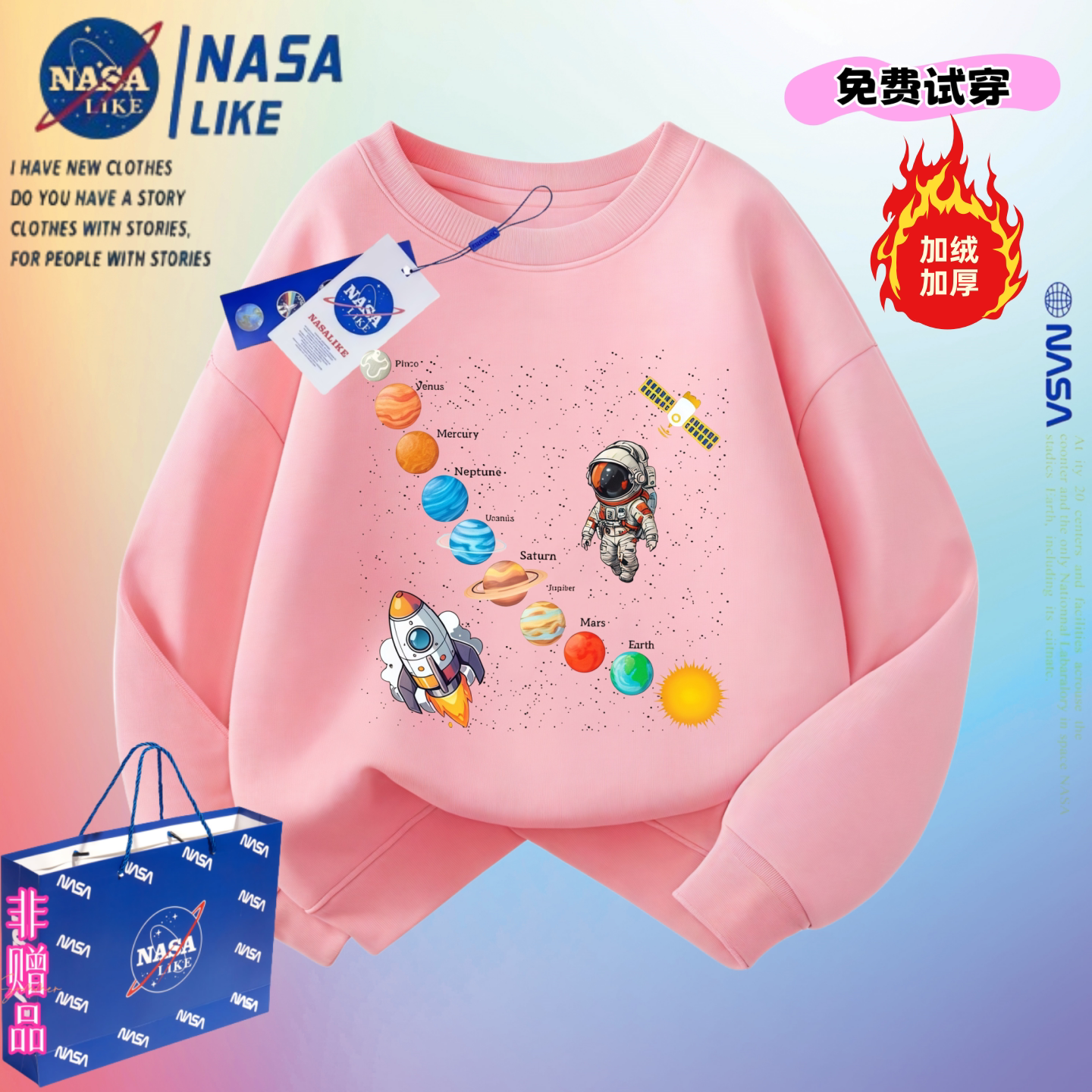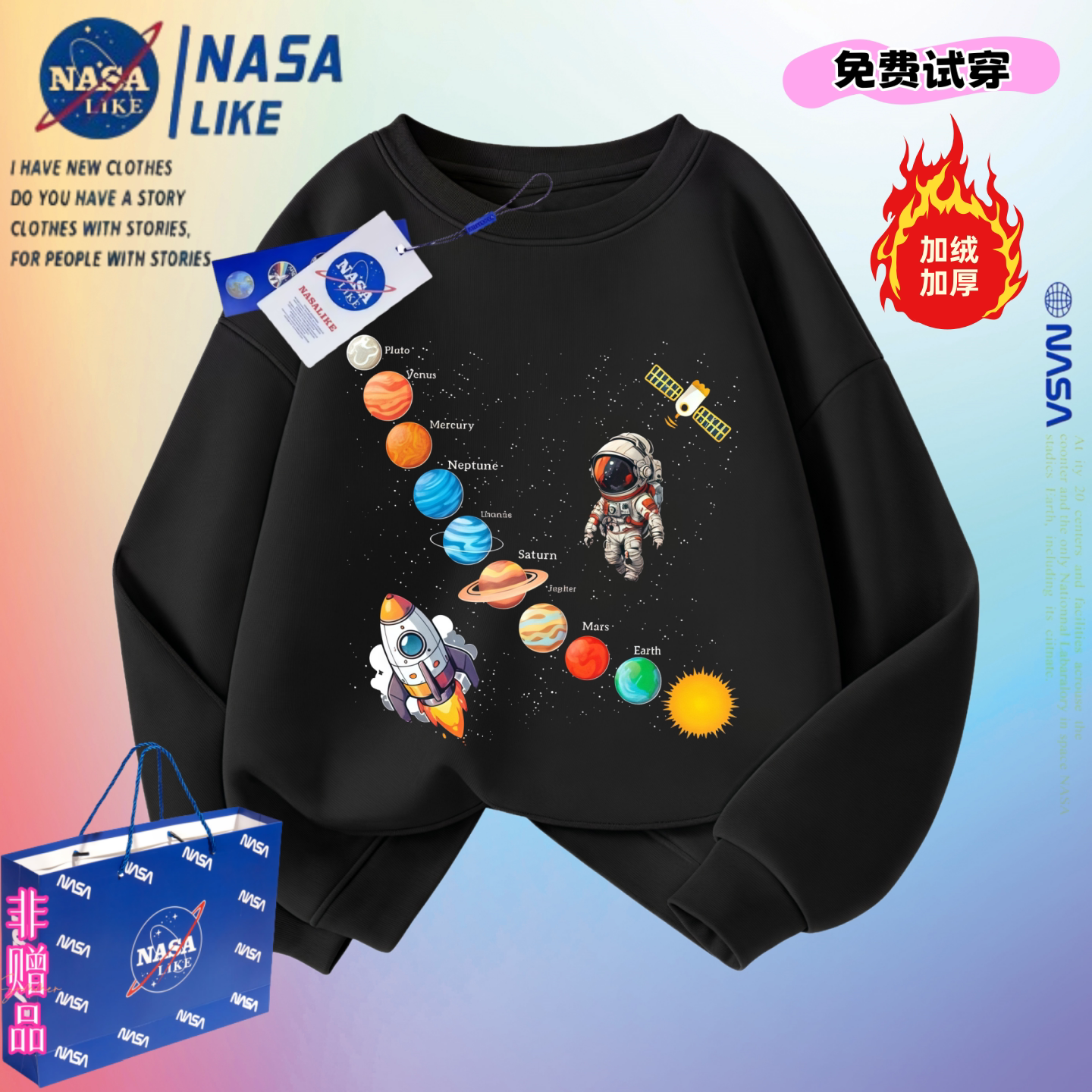 NASA太阳系宇航员火箭太空男女童加绒卫衣学生青少年班服秋冬上衣
