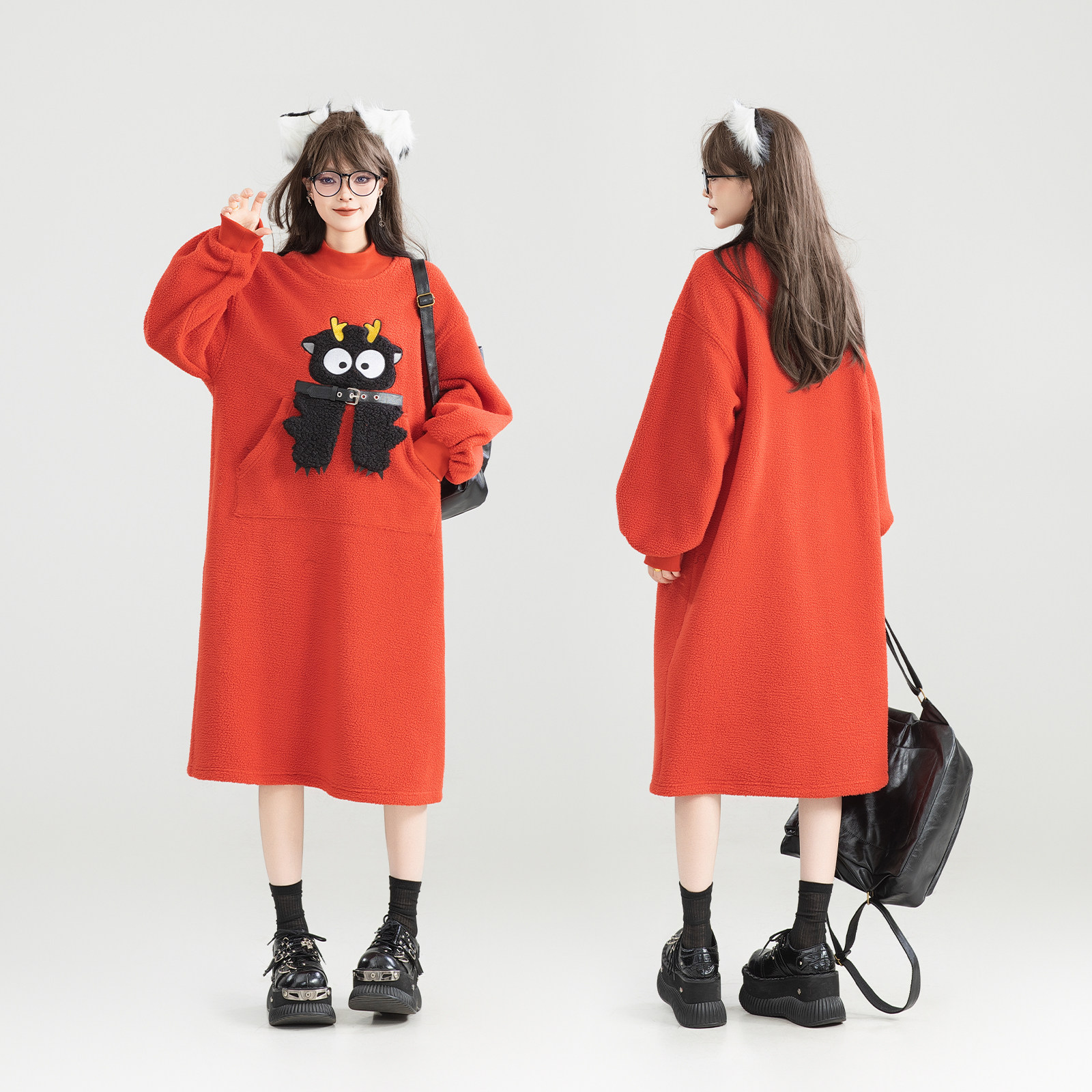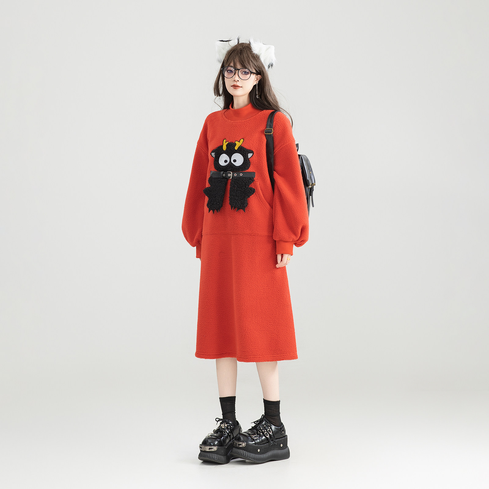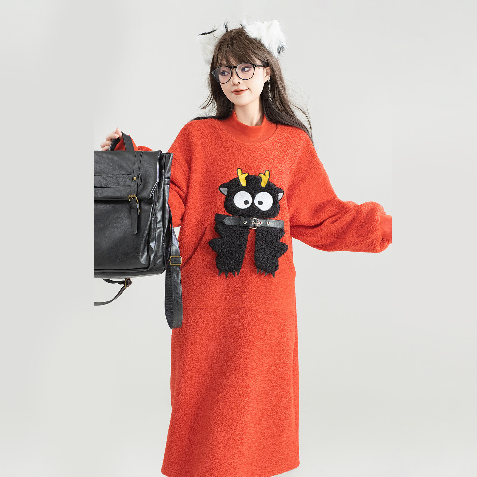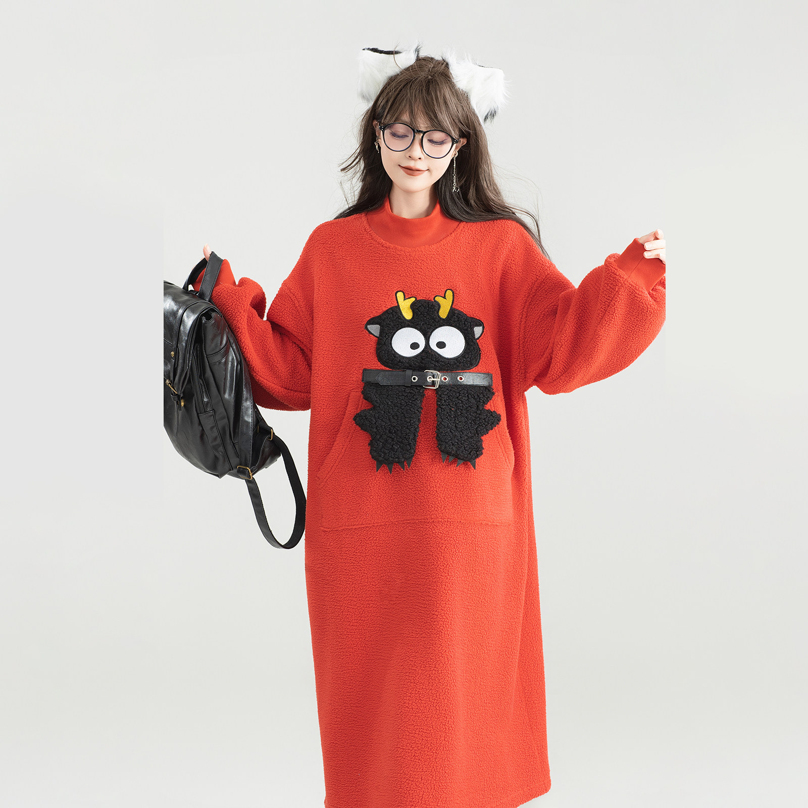KEIKO 萌系卡通绣花短绒连衣裙25秋冬氛围感减龄加厚毛绒卫衣长裙