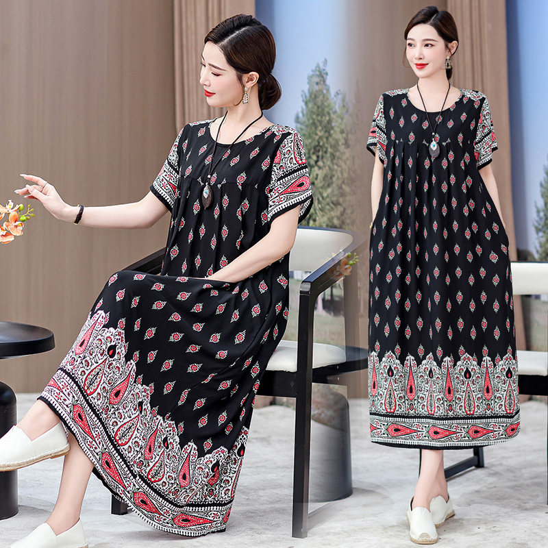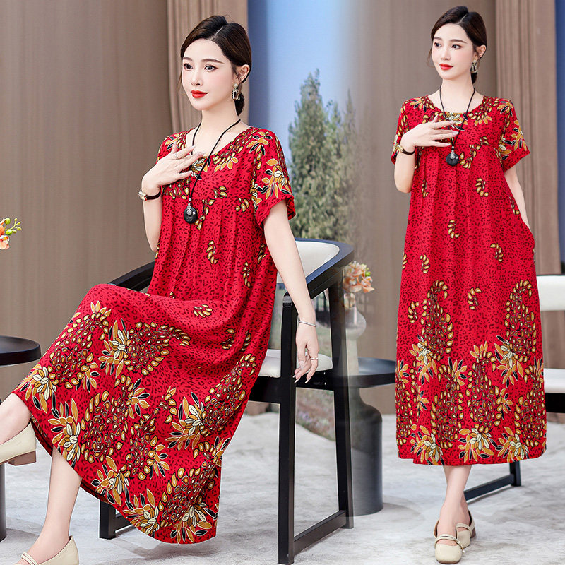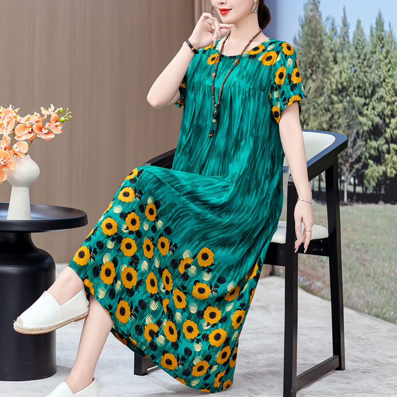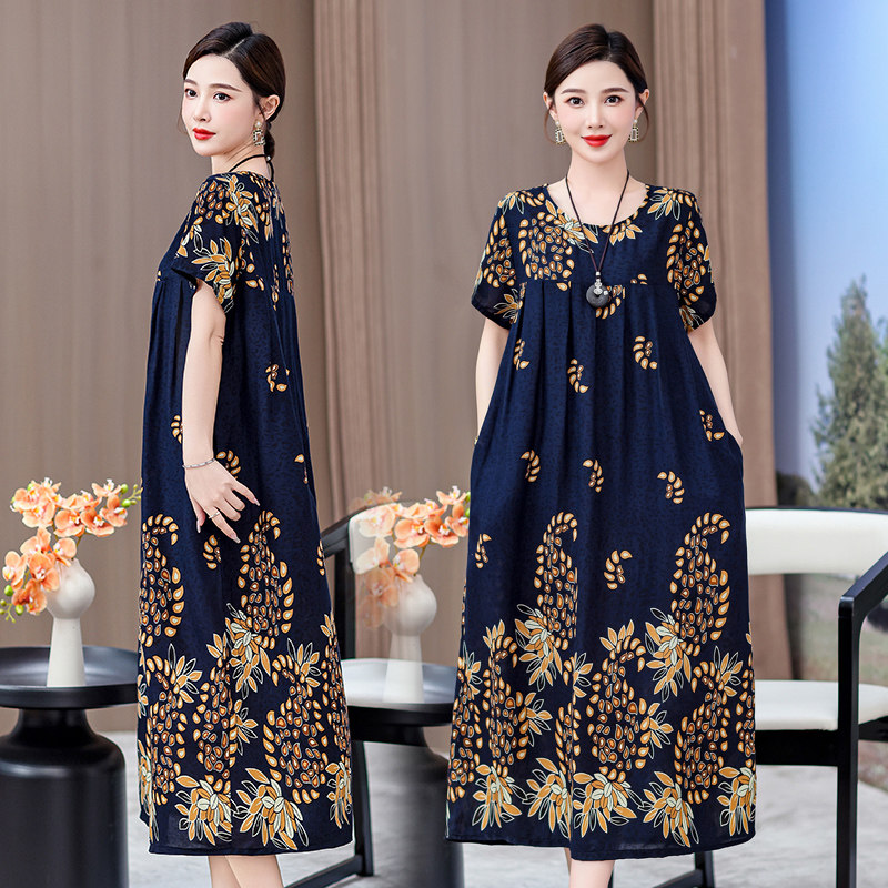 2026新款中老年棉绸连衣裙女夏季女装高贵过膝中年妈妈大摆长裙子