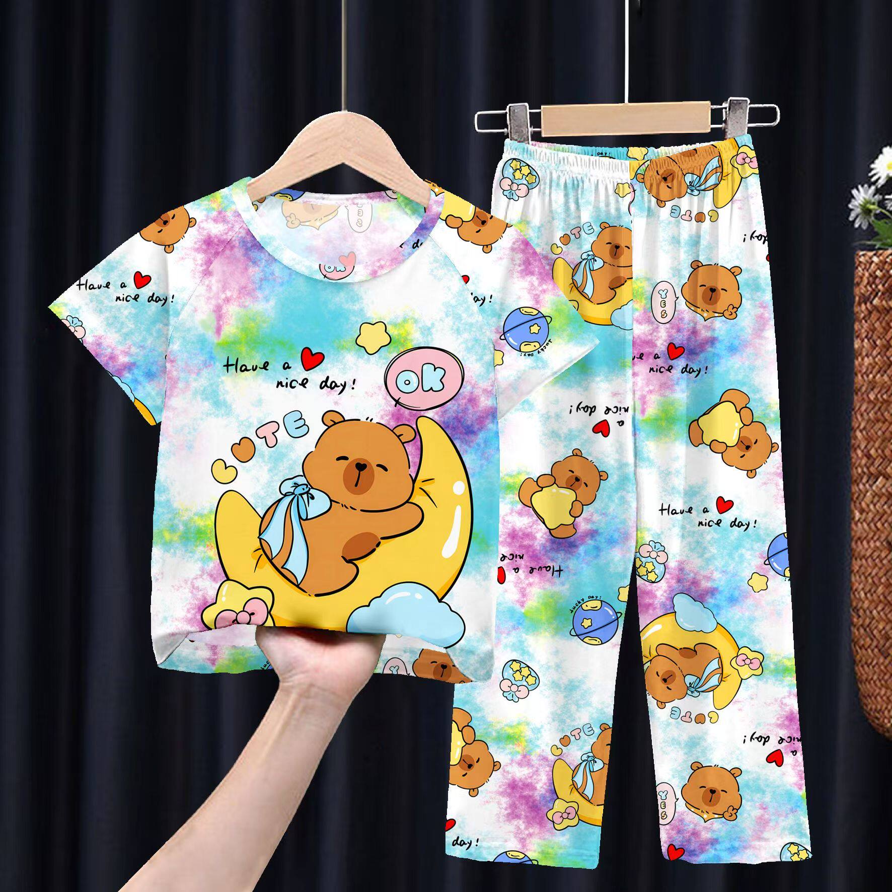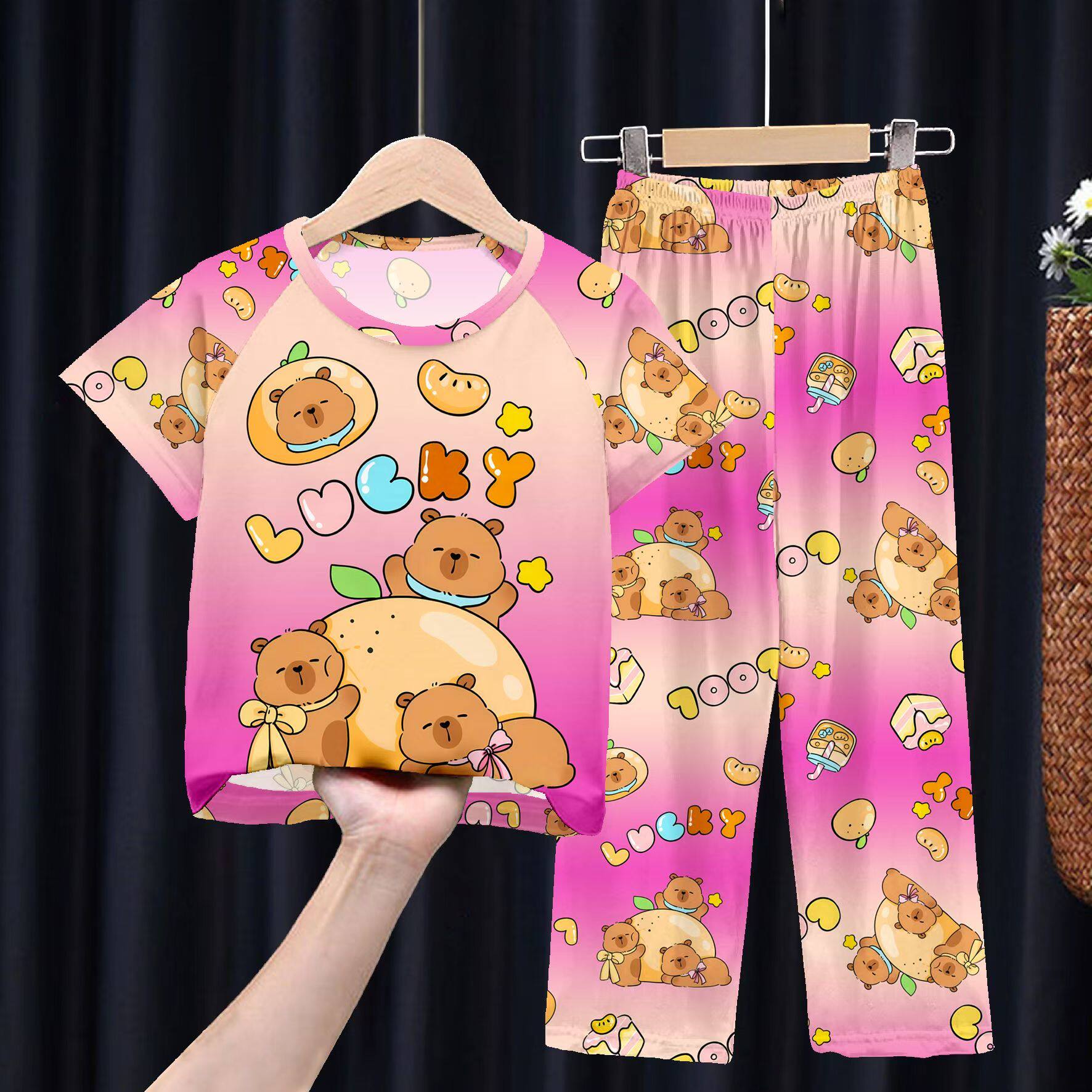 跨境儿童睡衣春夏季短袖长裤男童哪吒睡衣卡通套装薄款女孩家居服