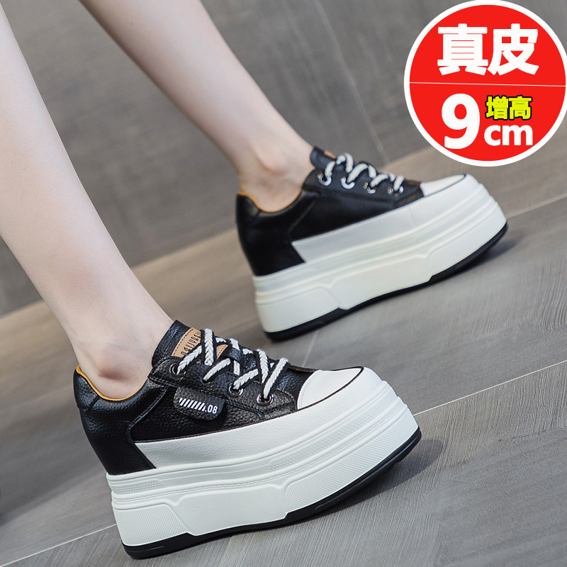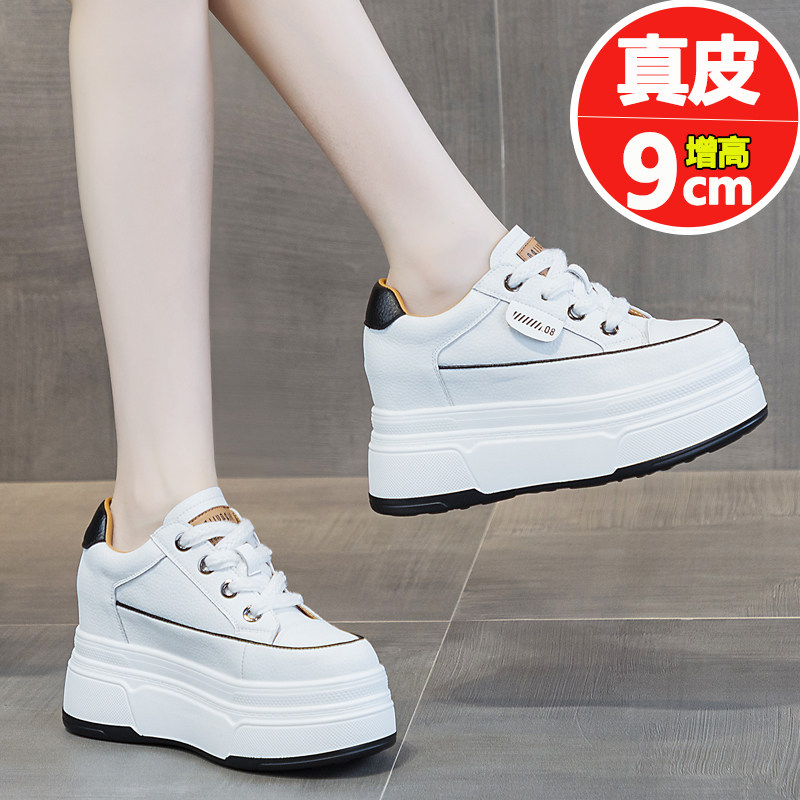 春秋新款内增高真皮小白鞋女9CM厚底坡跟休闲跑步女鞋显脚小显瘦