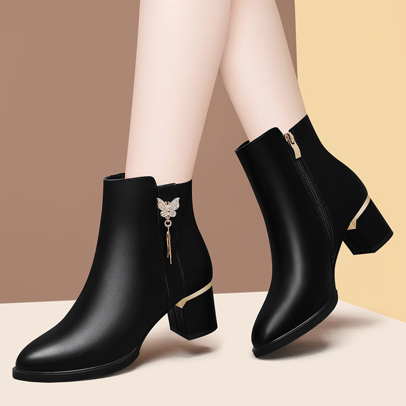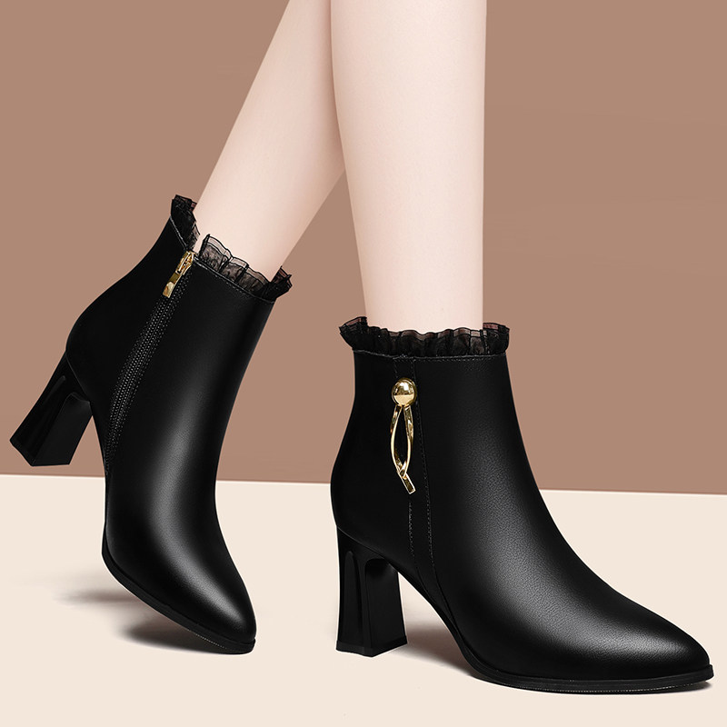 女士真皮短靴女尖头秋冬季新款加绒单靴中粗细跟马丁靴女高跟皮鞋