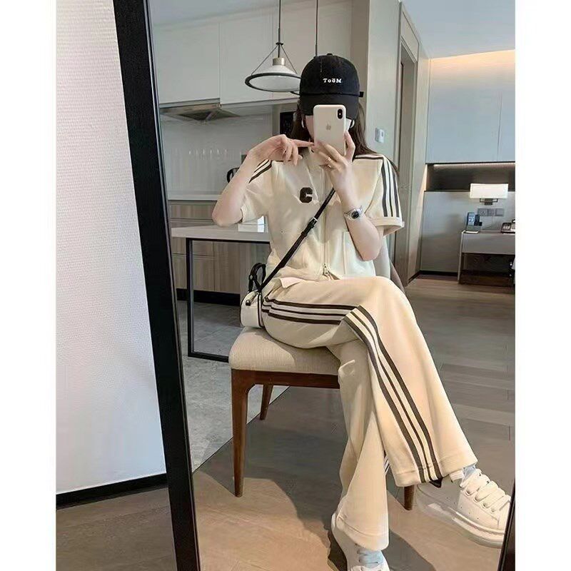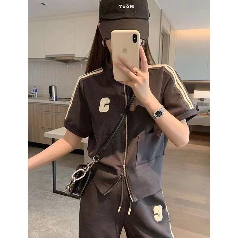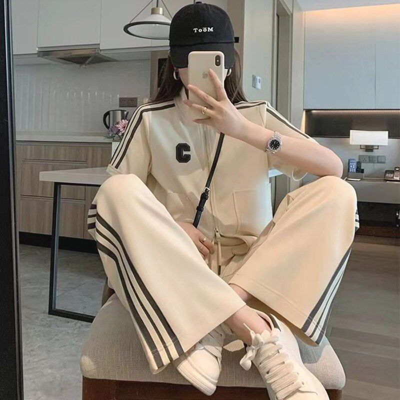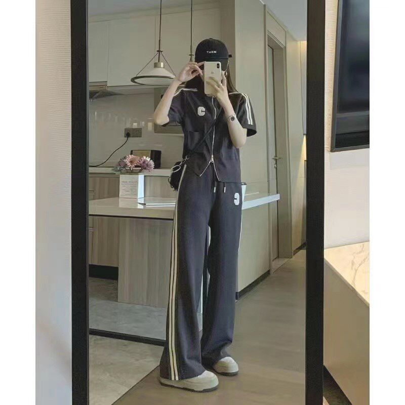 2024韩版夏季时尚小个子休闲运动套装女修身显瘦短款阔腿裤两件套