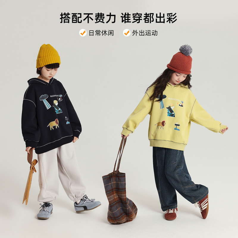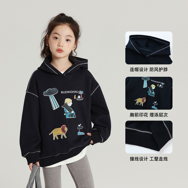 布丁哈鲁童装秋装女童宽松上衣2026春秋新款儿童撞色耐穿连帽卫衣