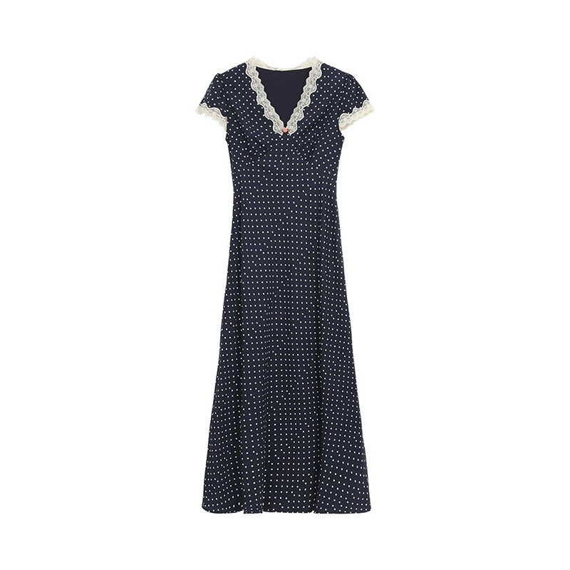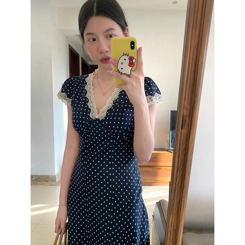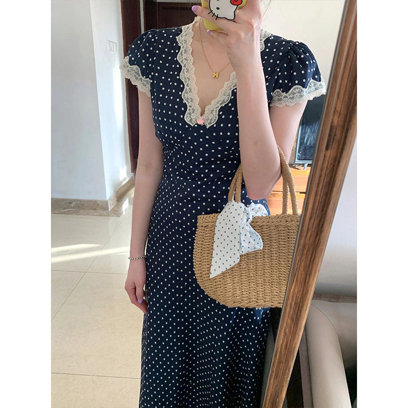 韩系温柔小个子气质高级感减龄波点连衣裙女夏季V领收腰显瘦长裙