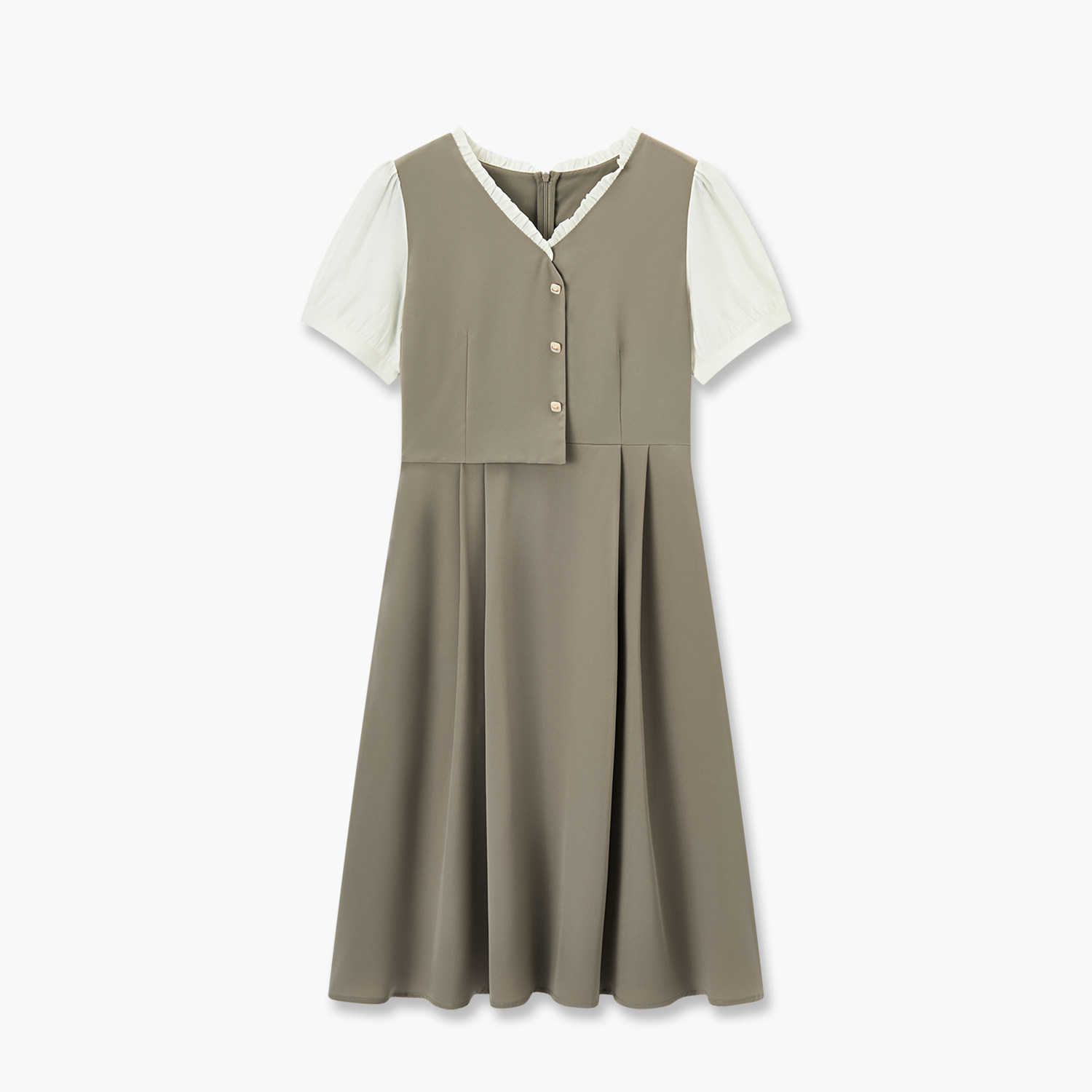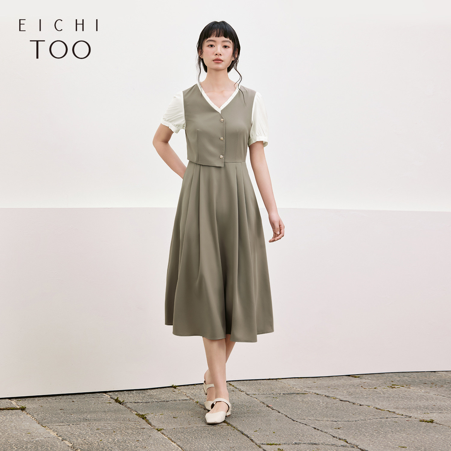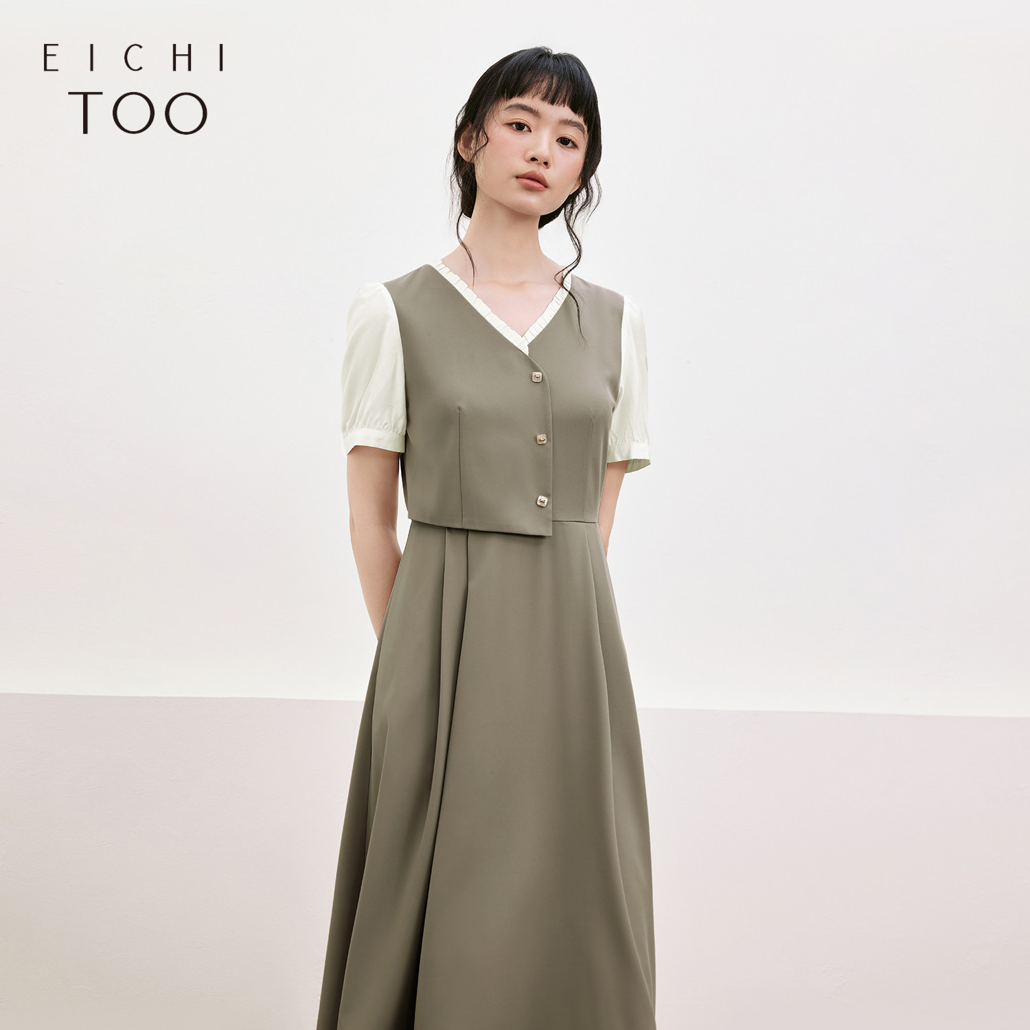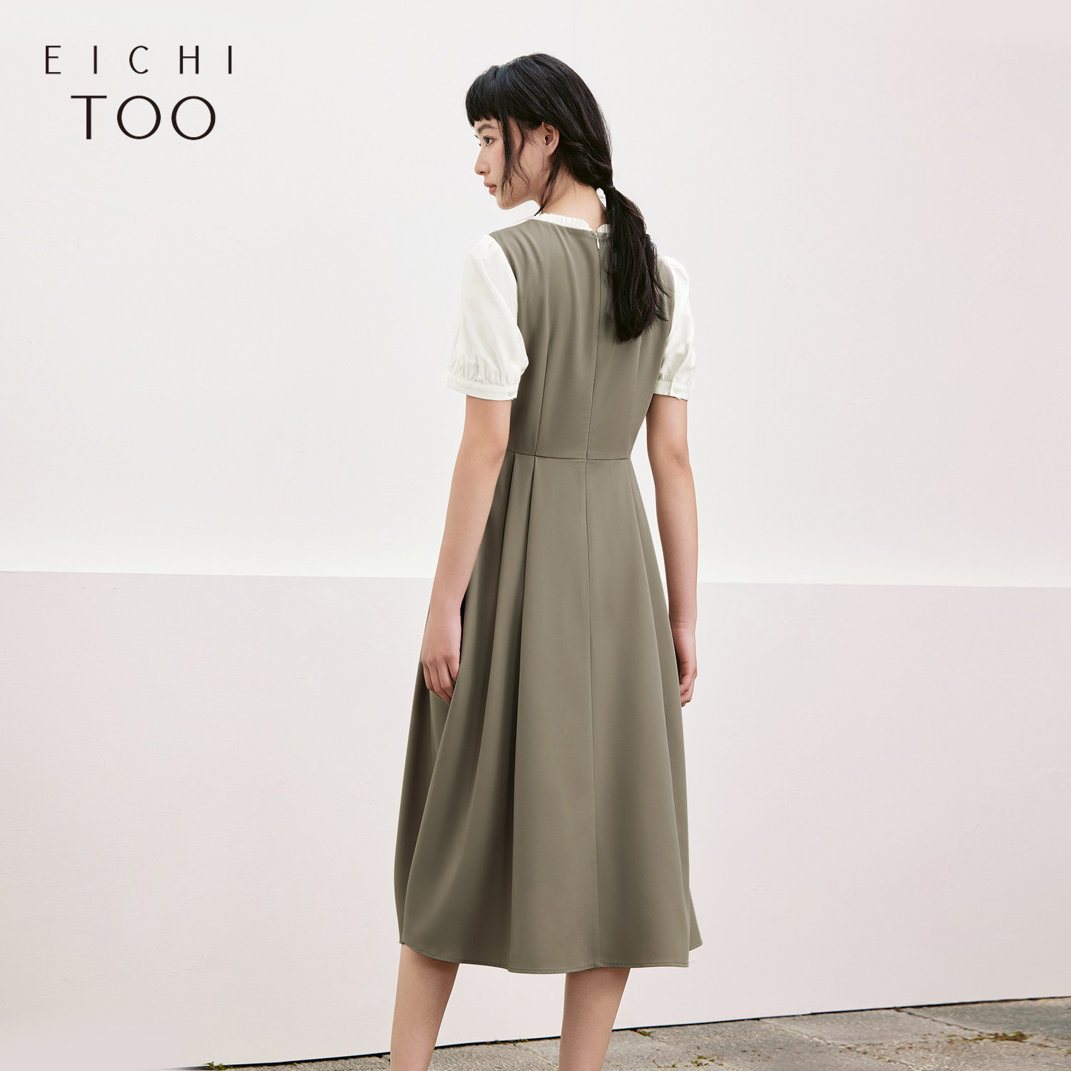 爱居兔假两件收腰连衣裙夏季新款通勤职场风短袖长裙