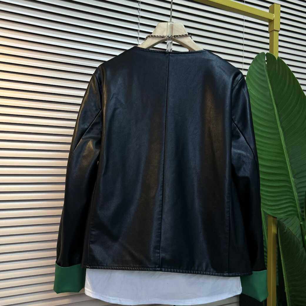 新中式国风盘扣皮衣外套女款春秋季大码胖mm黑色拼接短款夹克上衣