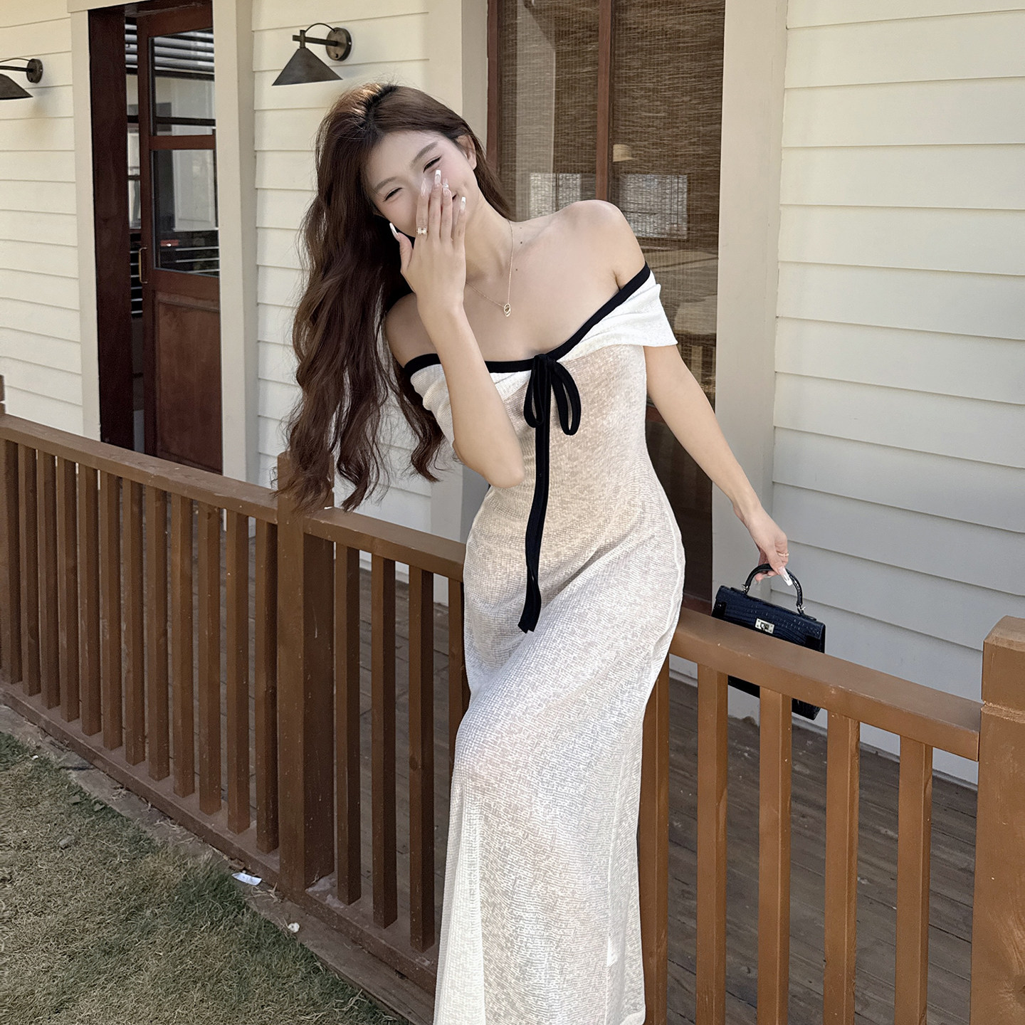 GirlsAt18 法式一字肩连衣裙女夏季高级白色系带气质修身包臀长裙