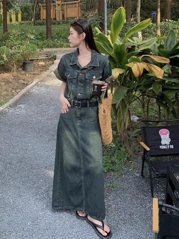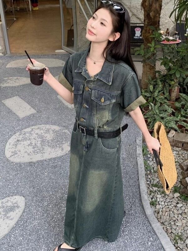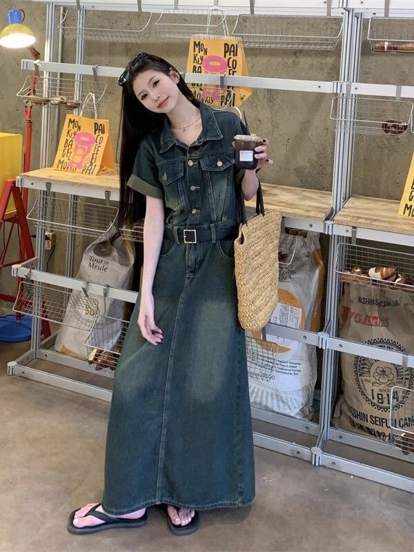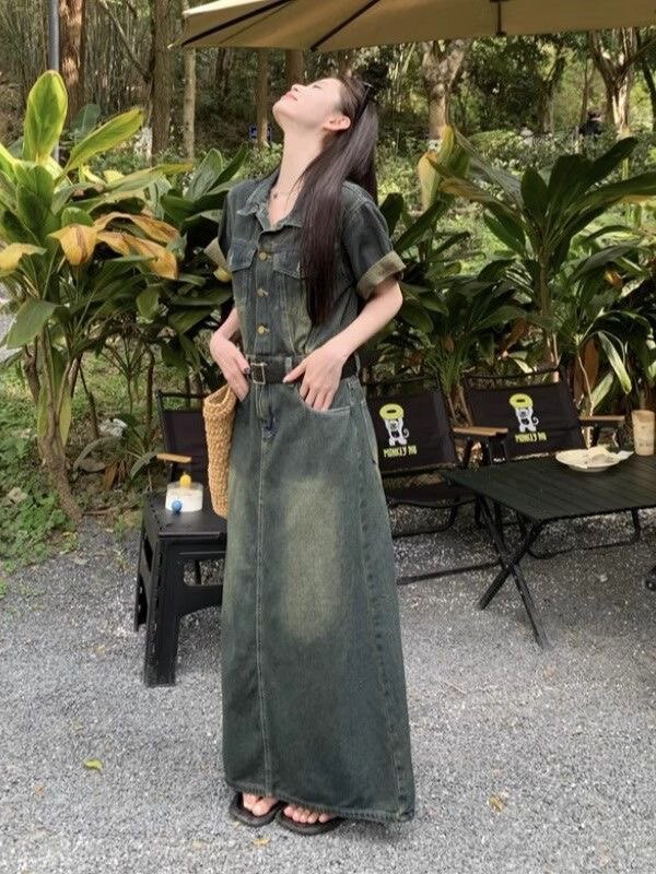 大码港风复古连衣裙女装夏季胖MM遮肚子显瘦裙子高级感a字牛仔裙