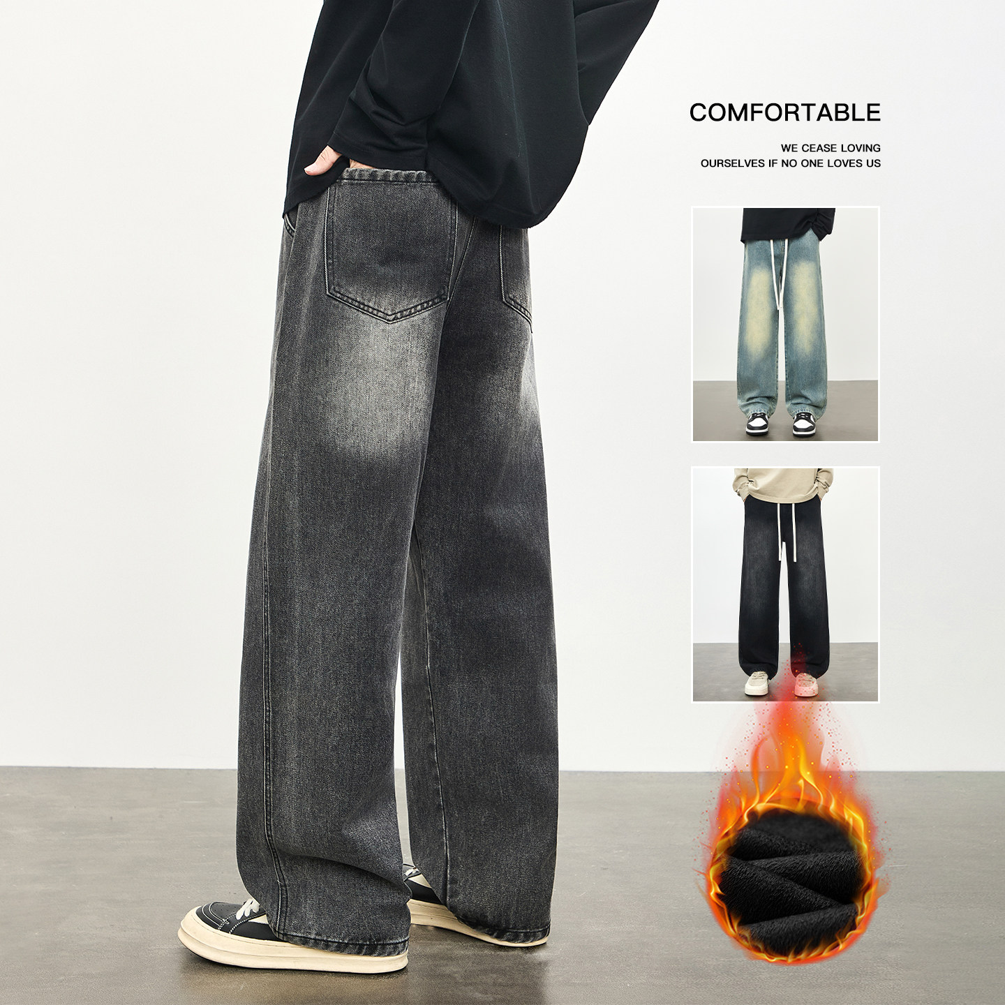 311线报网描述:冬季加绒加厚直筒显高水洗牛仔裤