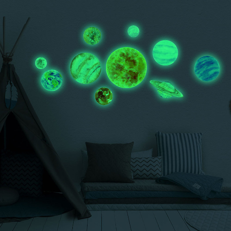 夜光星球月球水彩画太阳系墙贴自粘贴纸儿童房间装饰布置荧光贴画