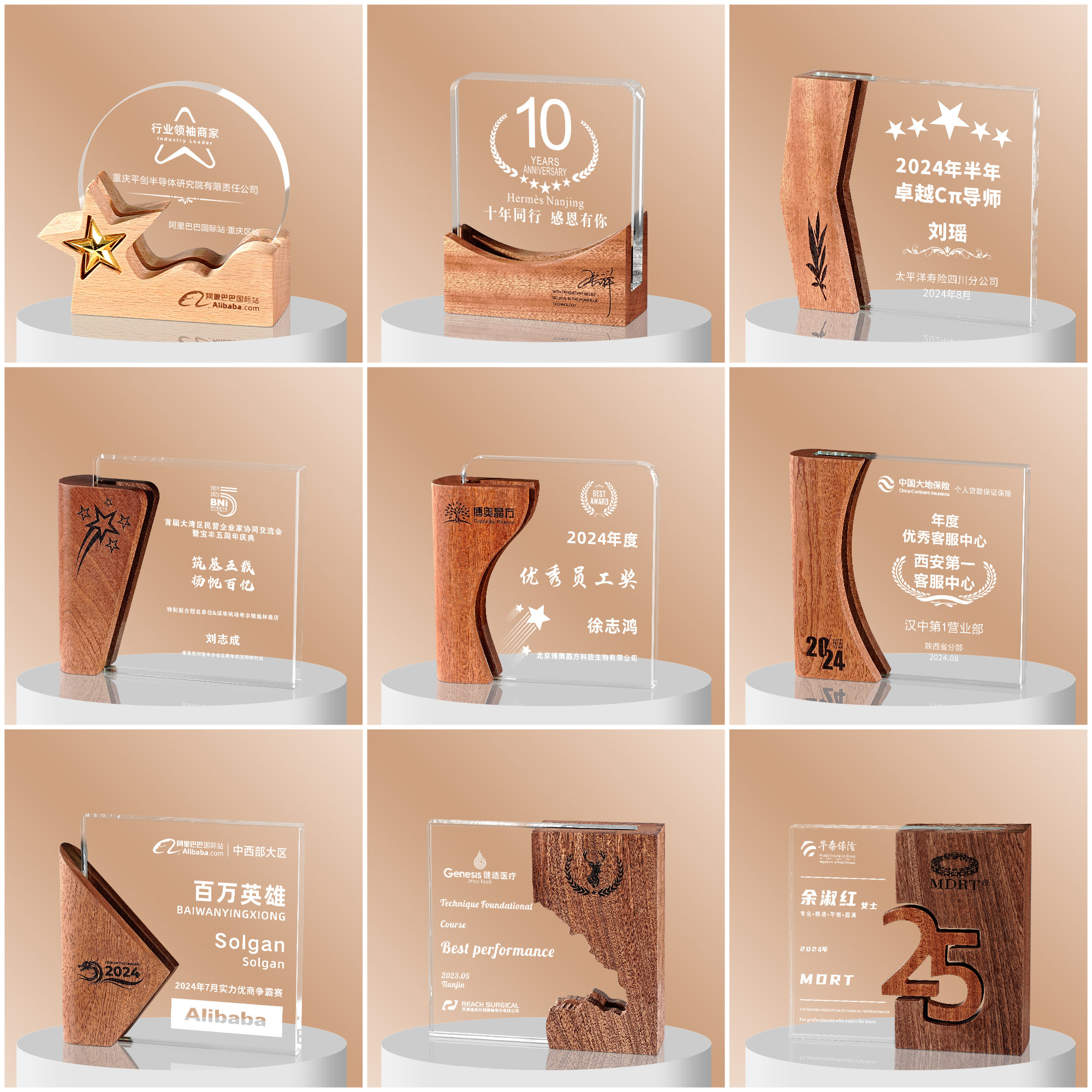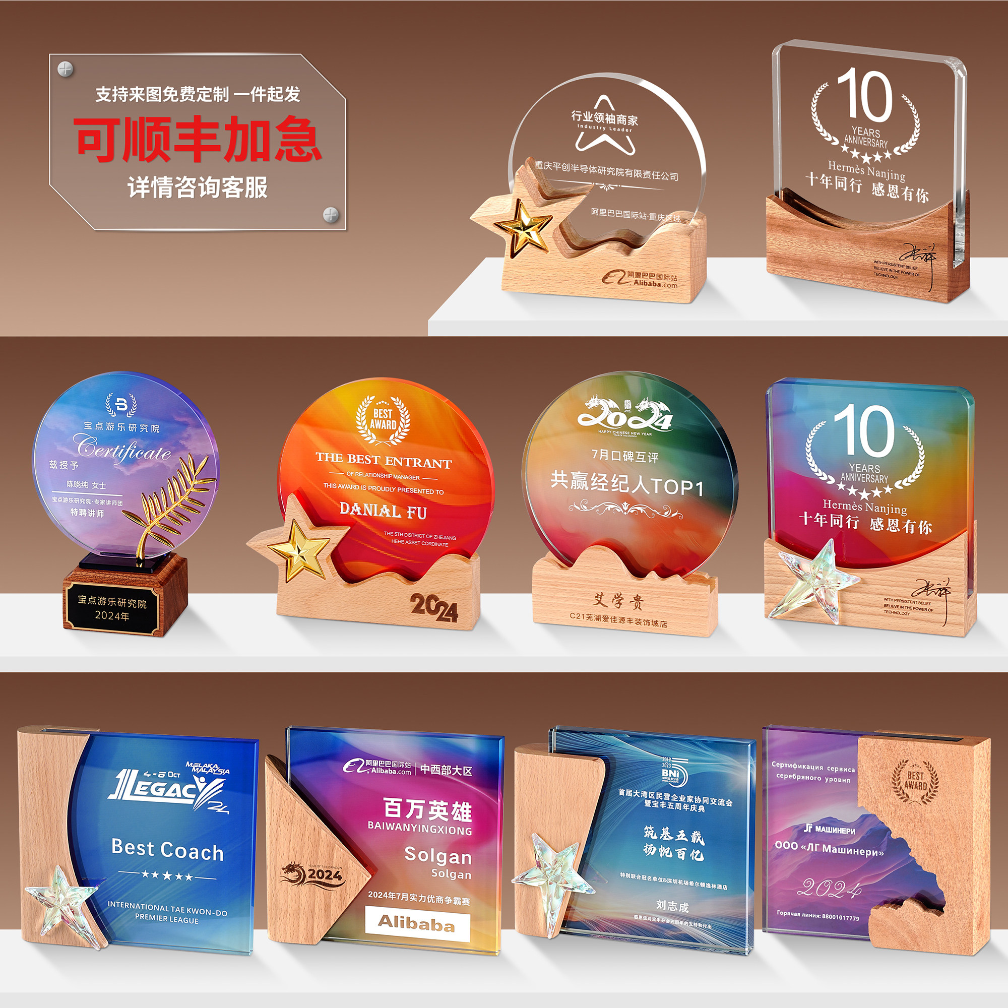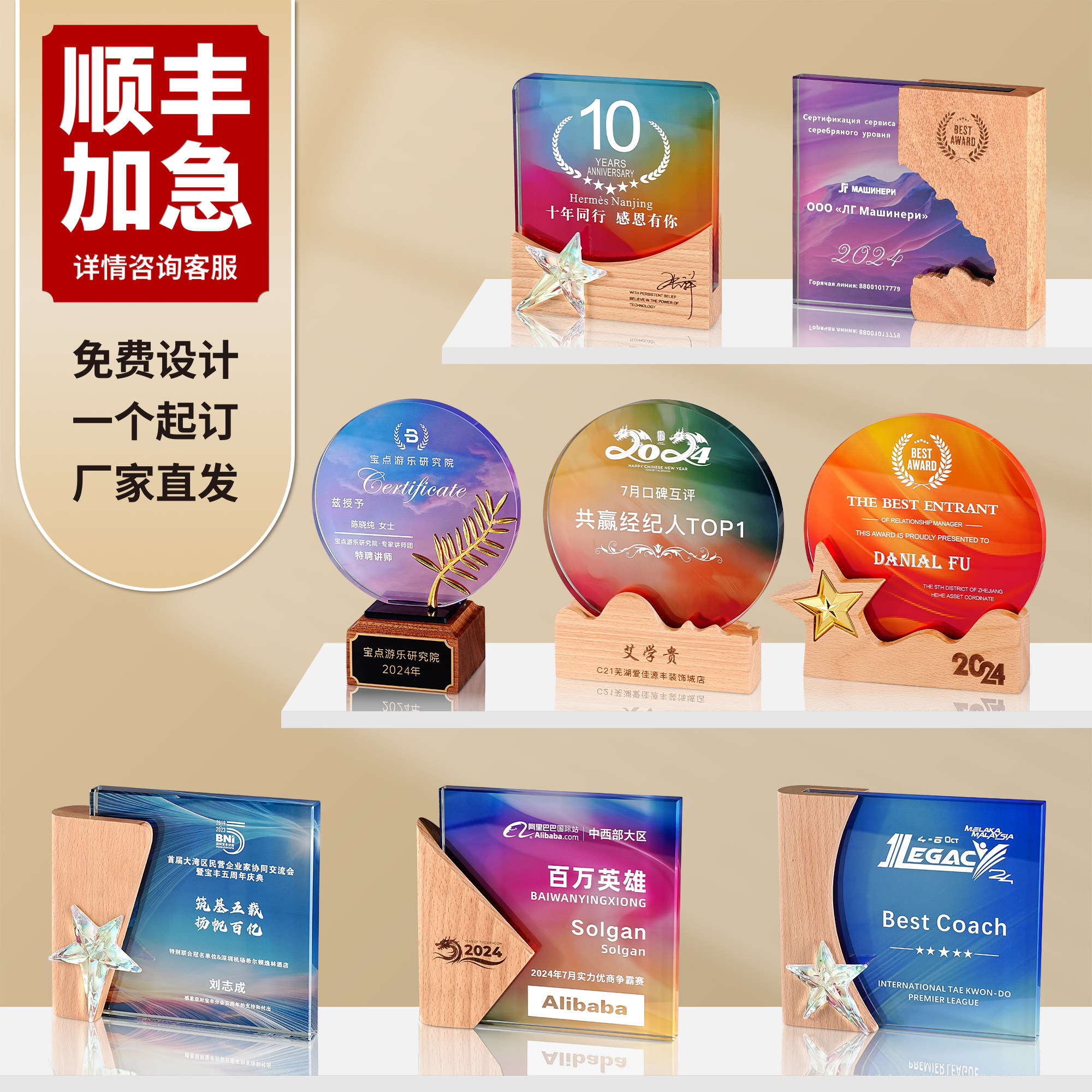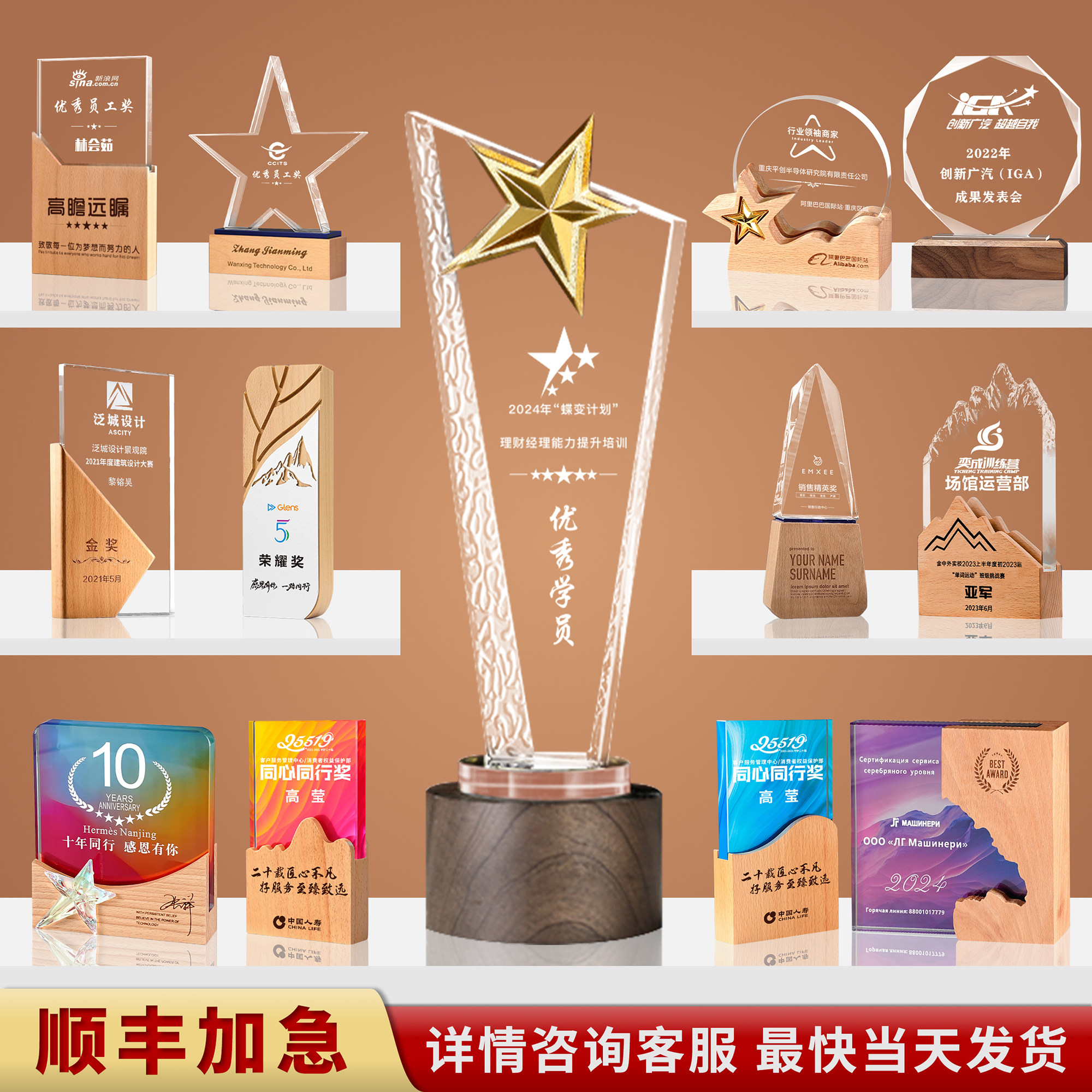 新款水晶奖杯定制创意实木奖牌国风企业优秀员工比赛年会颁奖定做