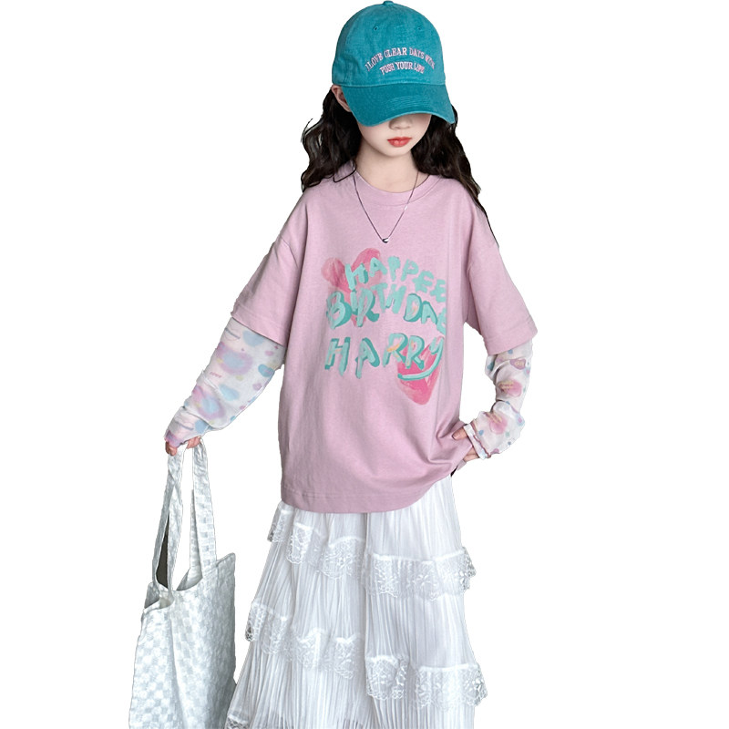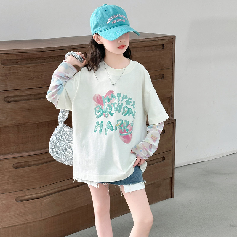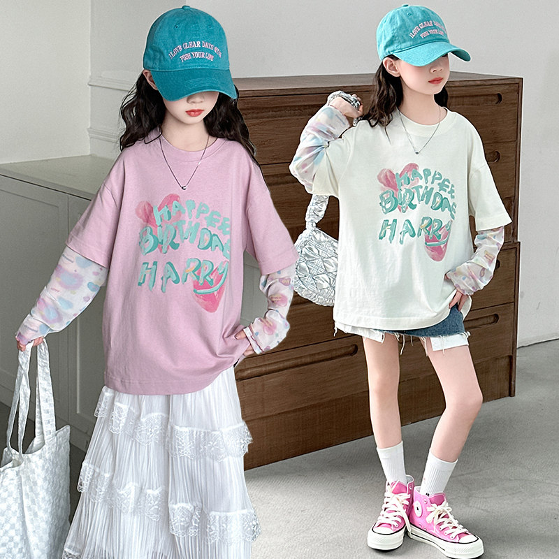 女童春装时尚休闲T恤2026新款洋气防晒短袖打底衫女孩假两件上衣