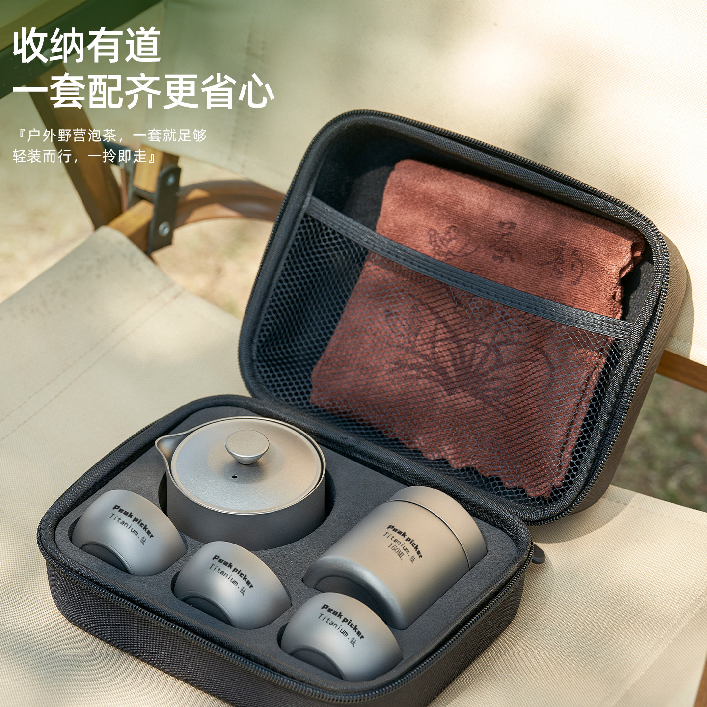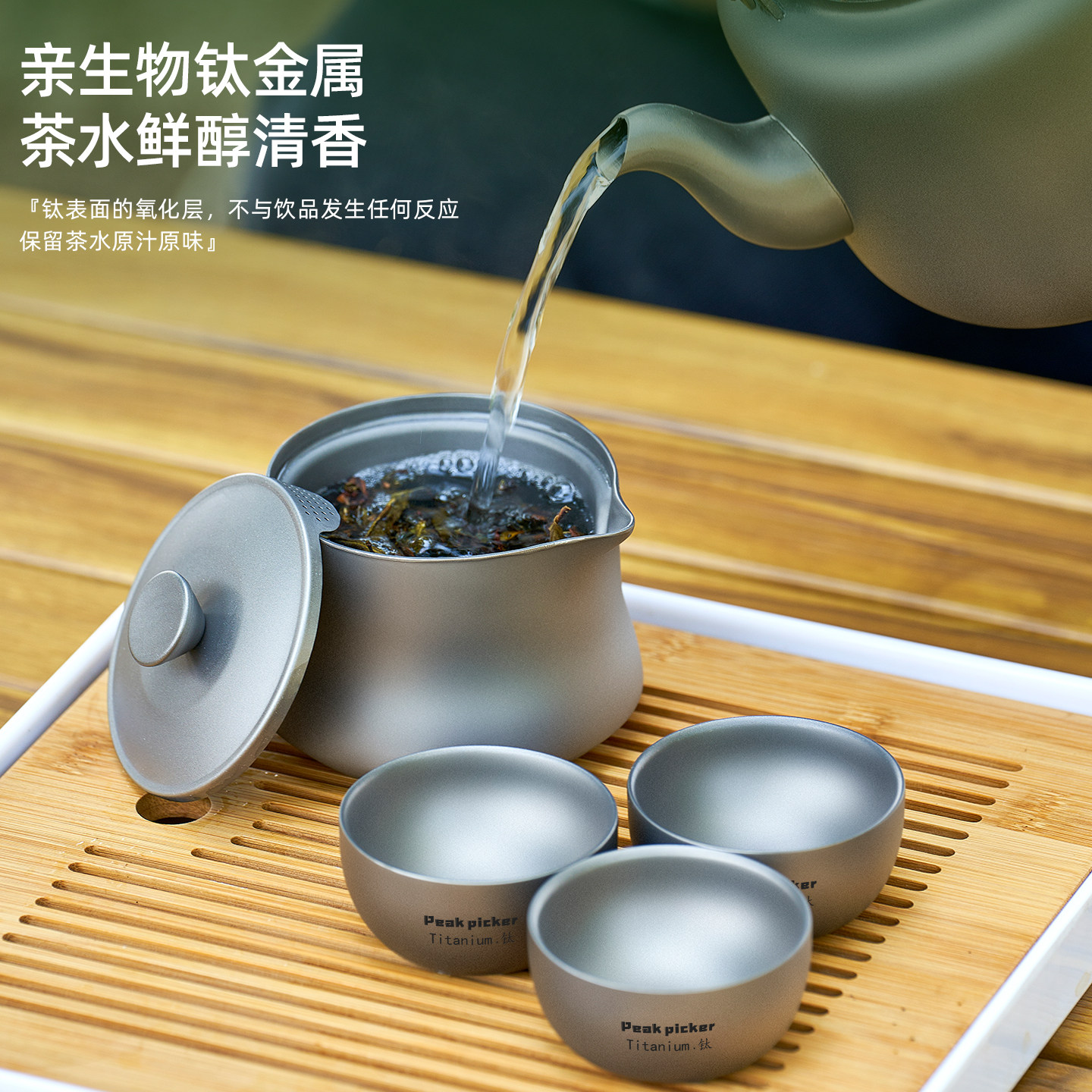 纯钛旅行茶具套装双层防烫钛茶具户外露营钛合金便携泡茶器筷客杯