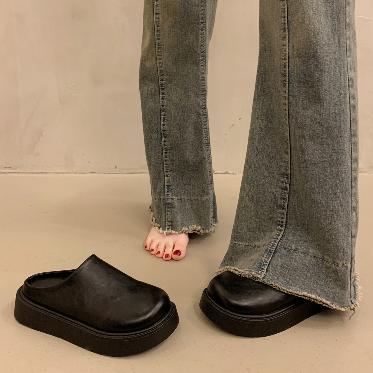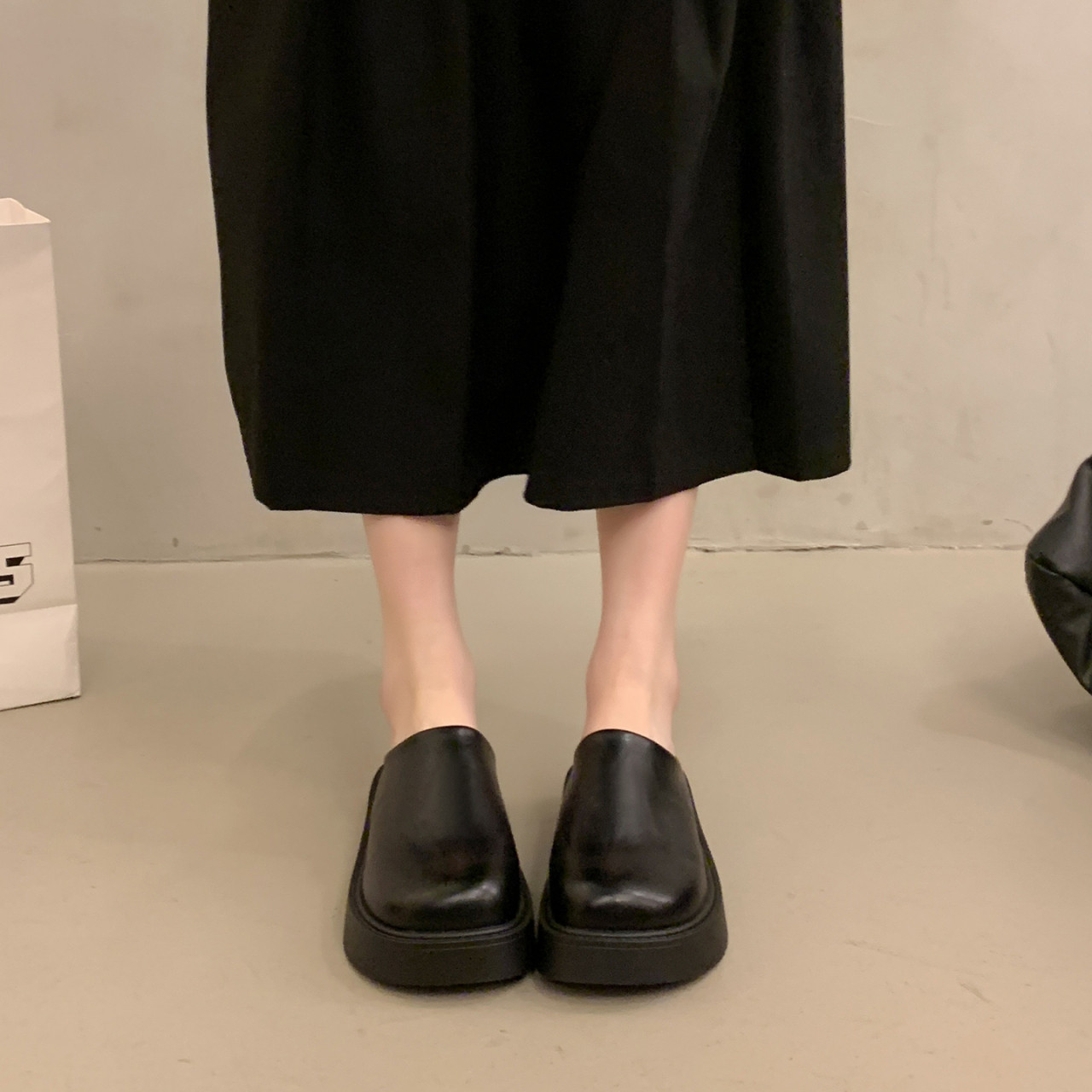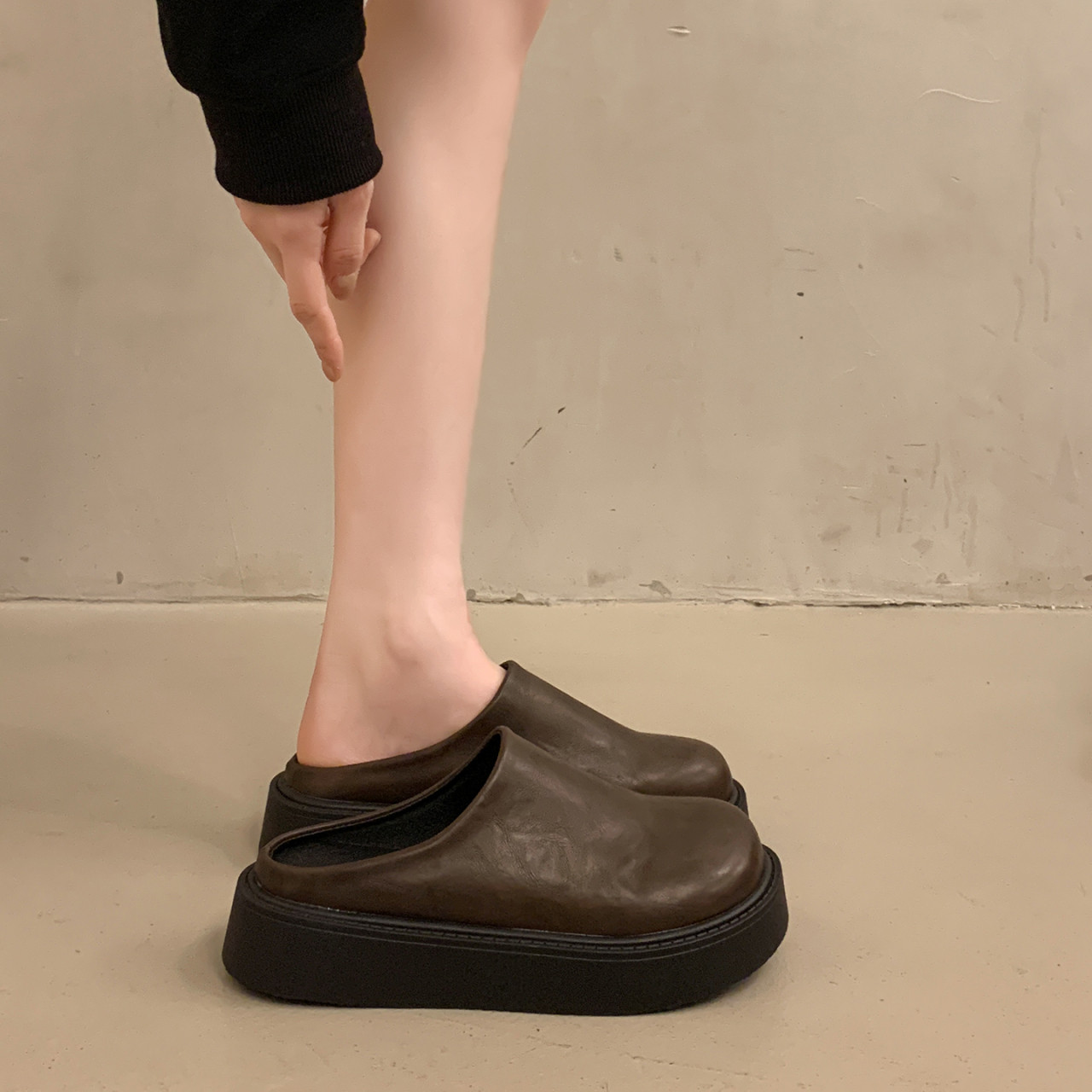 黑色包头半拖鞋女外穿2026春秋新款厚底勃肯鞋增高矮子乐懒人凉拖