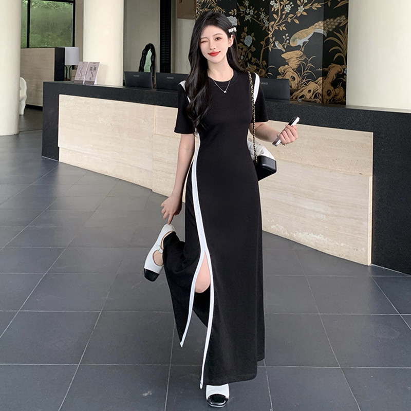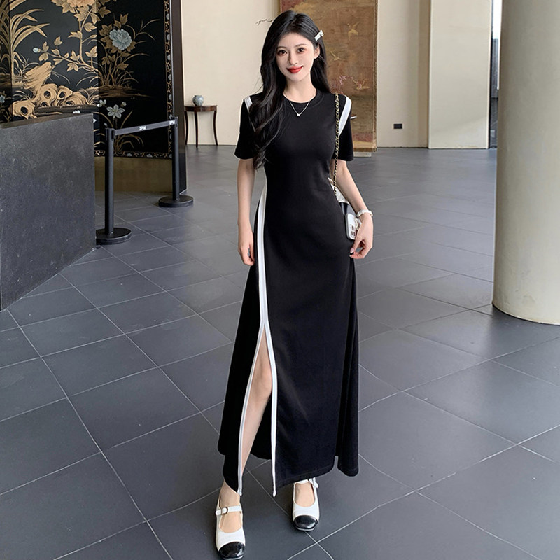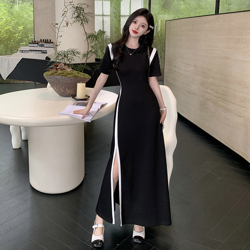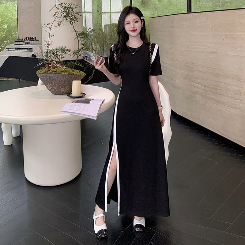 大码短袖连衣裙女夏季收腰显瘦包臀开叉长裙胖MM小众撞色气质裙子